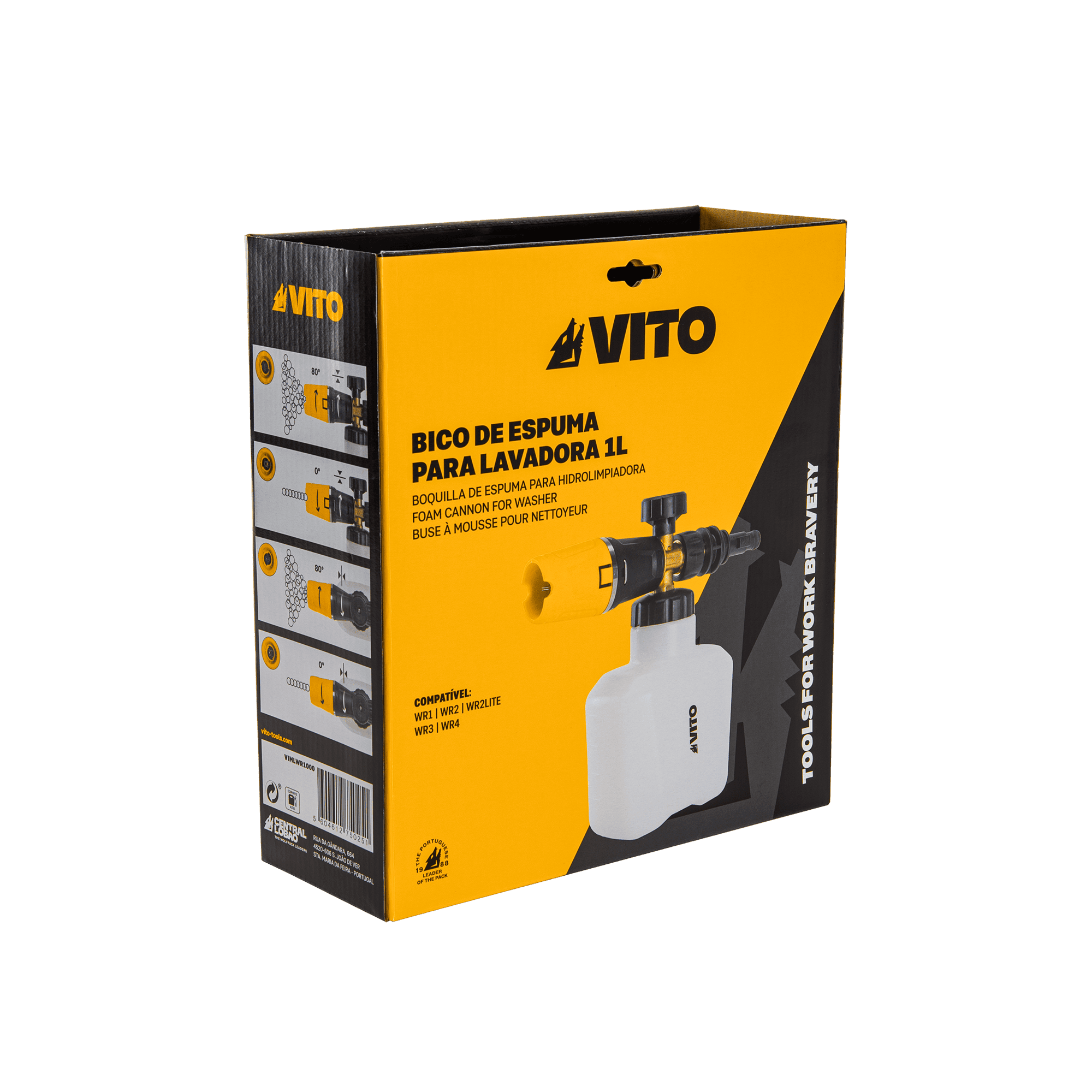 O Bico de Espuma para Lavadora da VITO (VIMLWR1000) é a solução ideal para aplicar detergente de forma eficiente e uniforme, potenciando a eficiência profissional das Lavadoras de Alta Pressão. Este acessório permite criar uma espuma densa e concentrada, melhorando a aderência do detergente às superfícies e facilitando a remoção de sujidade. Com um depósito de 1L, oferece maior autonomia para sessões de limpeza mais longas, otimizando o trabalho do utilizador. O bico de espuma está equipado com um bocal que pode ser ajustado entre 0 e 80º, possibilitando a adaptação do tipo de spray da lavadora conforme as necessidades da tarefa. Além disso, permite direcionar a espuma tanto na posição vertical como horizontal, oferecendo maior versatilidade na aplicação dos produtos de limpeza. Para além disto, é compatível com lavadoras de alta pressão da VITO, sendo o seu uso aconselhado com as lavadoras WR1, WR2, WR2LITE, WR3 e WR4.