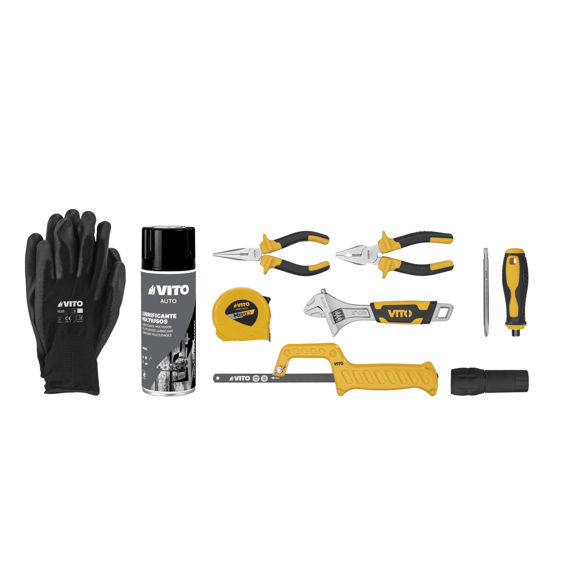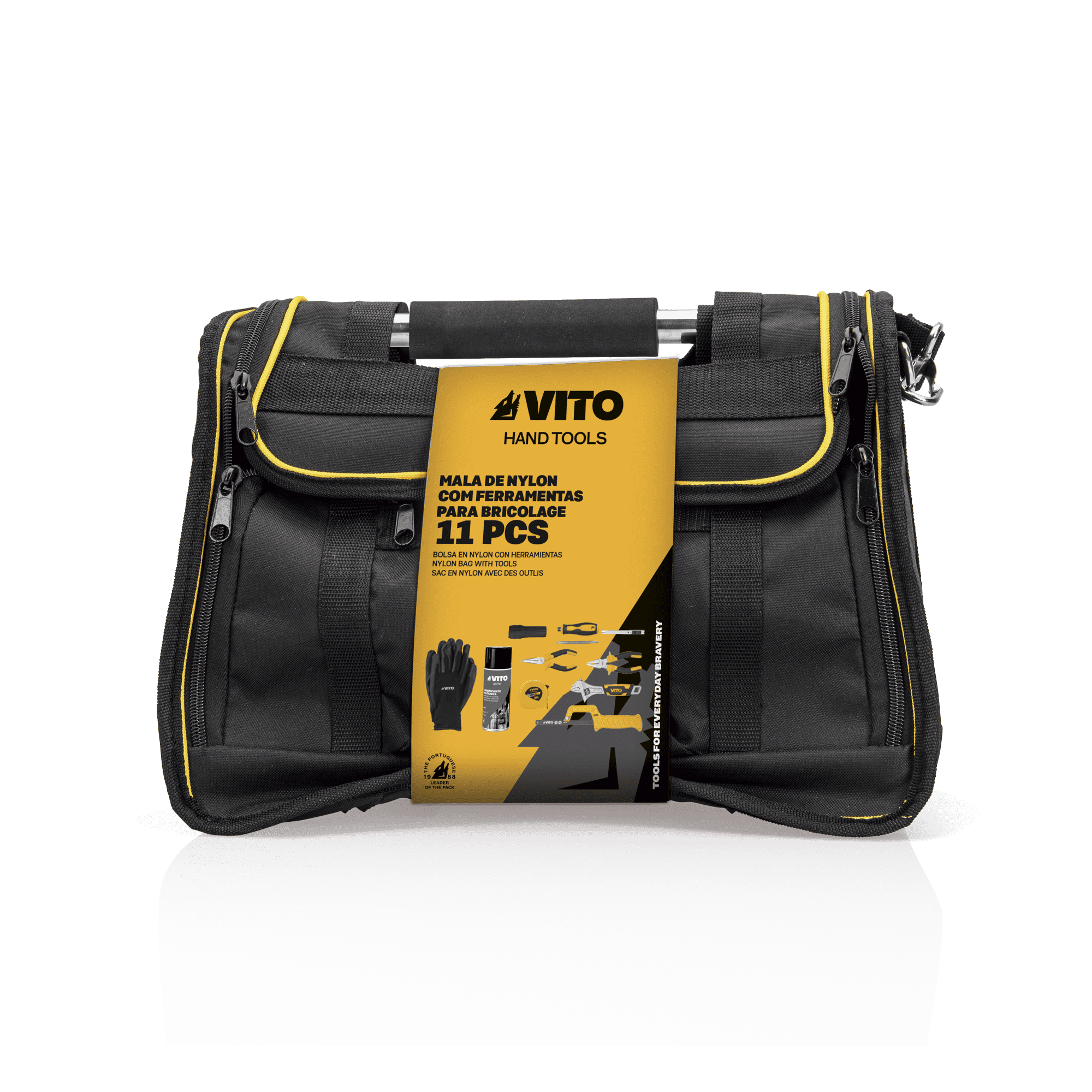 Mala em Nylon com Ferramentas para Bricolage com 11 peças, 1 mala em nylon para ferramentas, 1 mini serrote, 1 lubrificante multiusos, 2 chaves, 2 alicates, 1 cortador metálico, 1 par de luvas, 1 fita métrica e 1 lanterna.