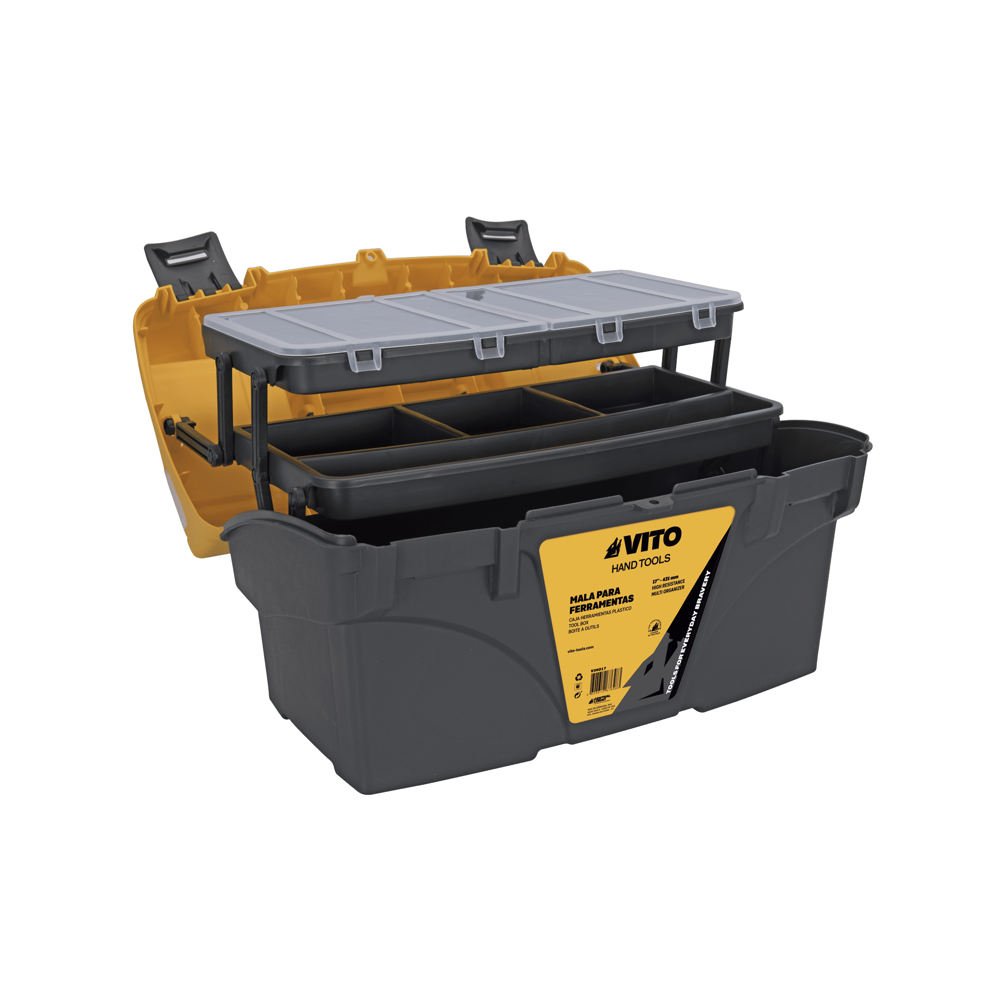 Mala para Ferramentas com Organizador, tem uma pega retráctil, possui uma tampa com 3 compartimentos, tem ainda 2 tabuleiros para ferramentas e um fecho por cadeado (não incluido).