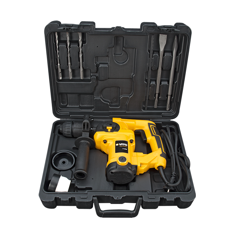 Martelo Perfurador Demolidor com uma potência nominal de 710W, tem uma energia de impacto de 2,6 J, com uma velocidade de rotação em vazio de 0-800rpm e uma frequência de impacto de 0-5000ipm, tem uma bucha de bloqueio/desbloqueio SDS-Plus, com 3 funções, para executar todas as suas atividades com qualidade.