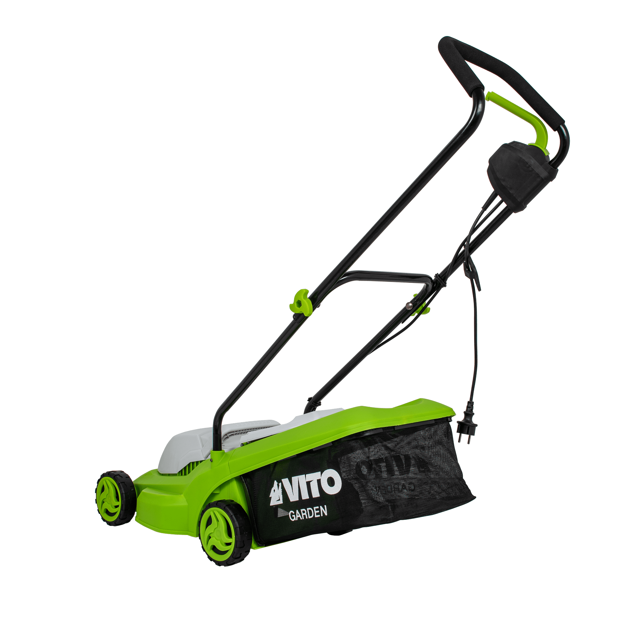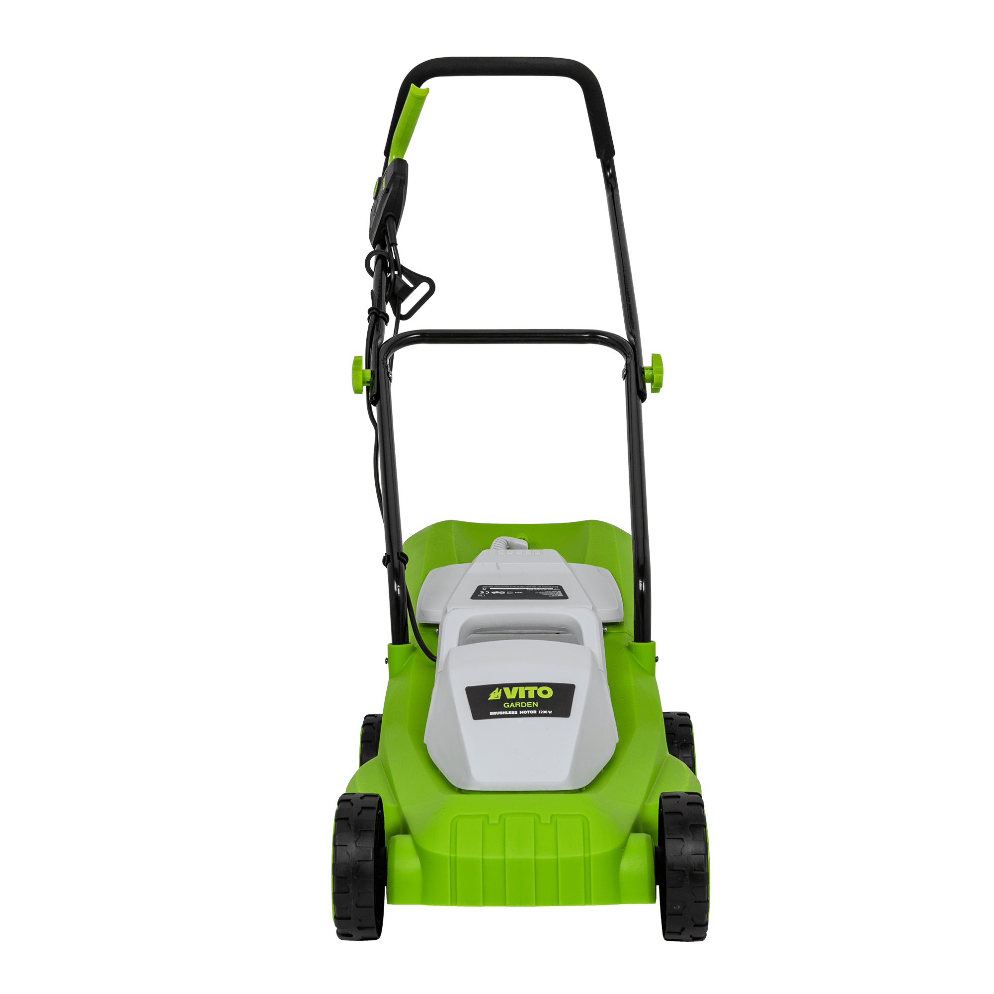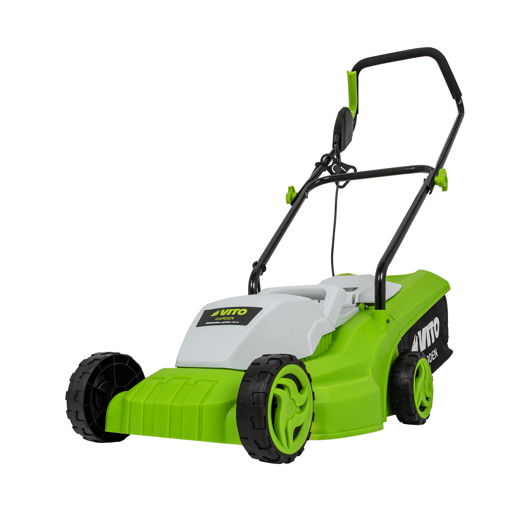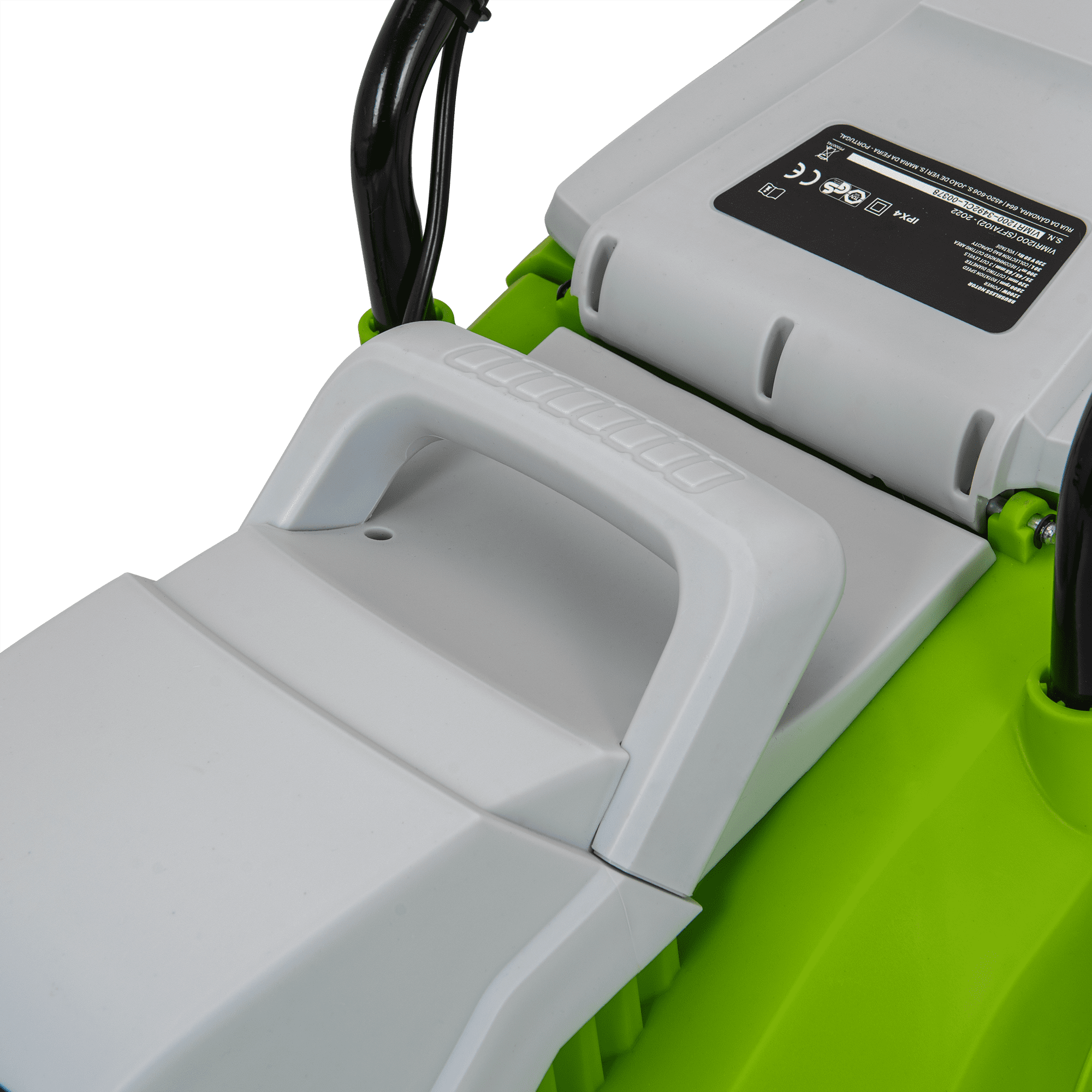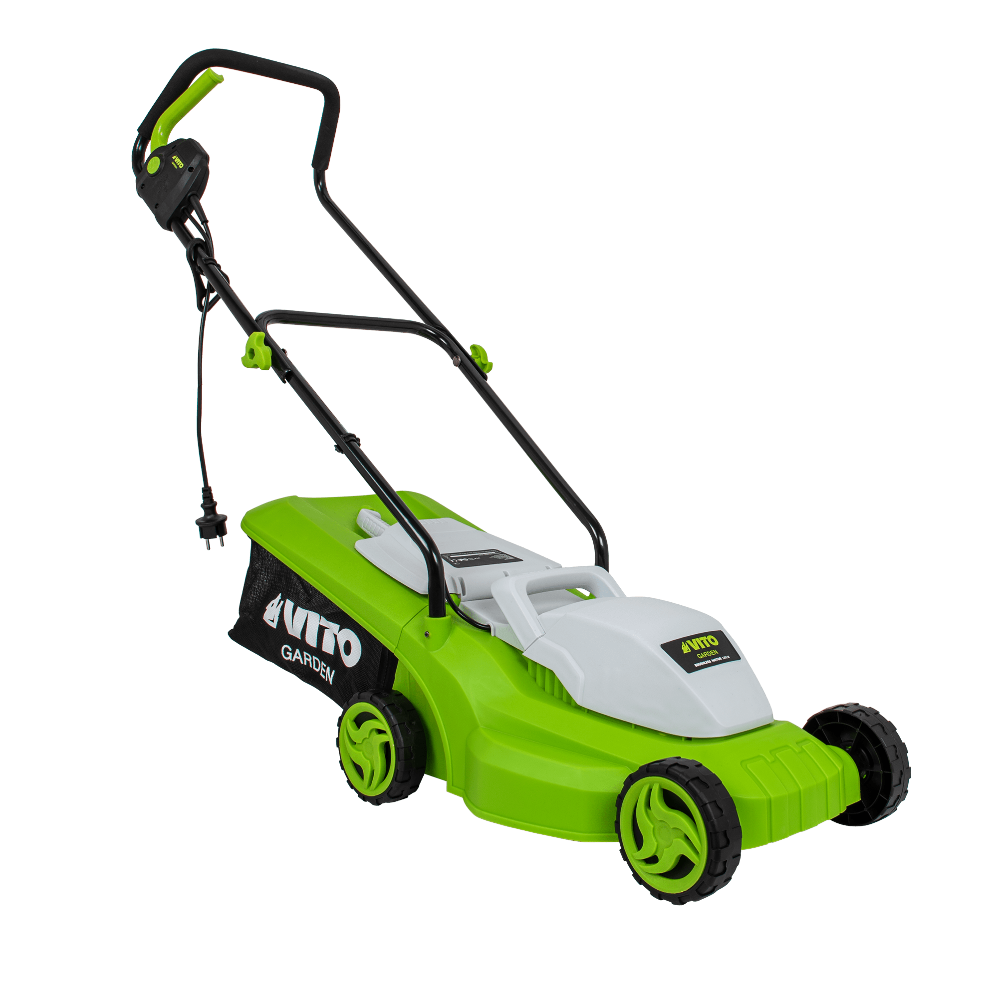 Máquina de Cortar Relva com uma potência de 1200W, com uma tensão de 230V 50Hz, tem um motor de indução, com uma rotação de 2800rpm, 320mm de diâmetro de corte, tem 3 níveis de corte 25 - 60mm, rodas com um diâmetro de 130mm, Máquina de Cortar Relva com uma capacidade de 30L.