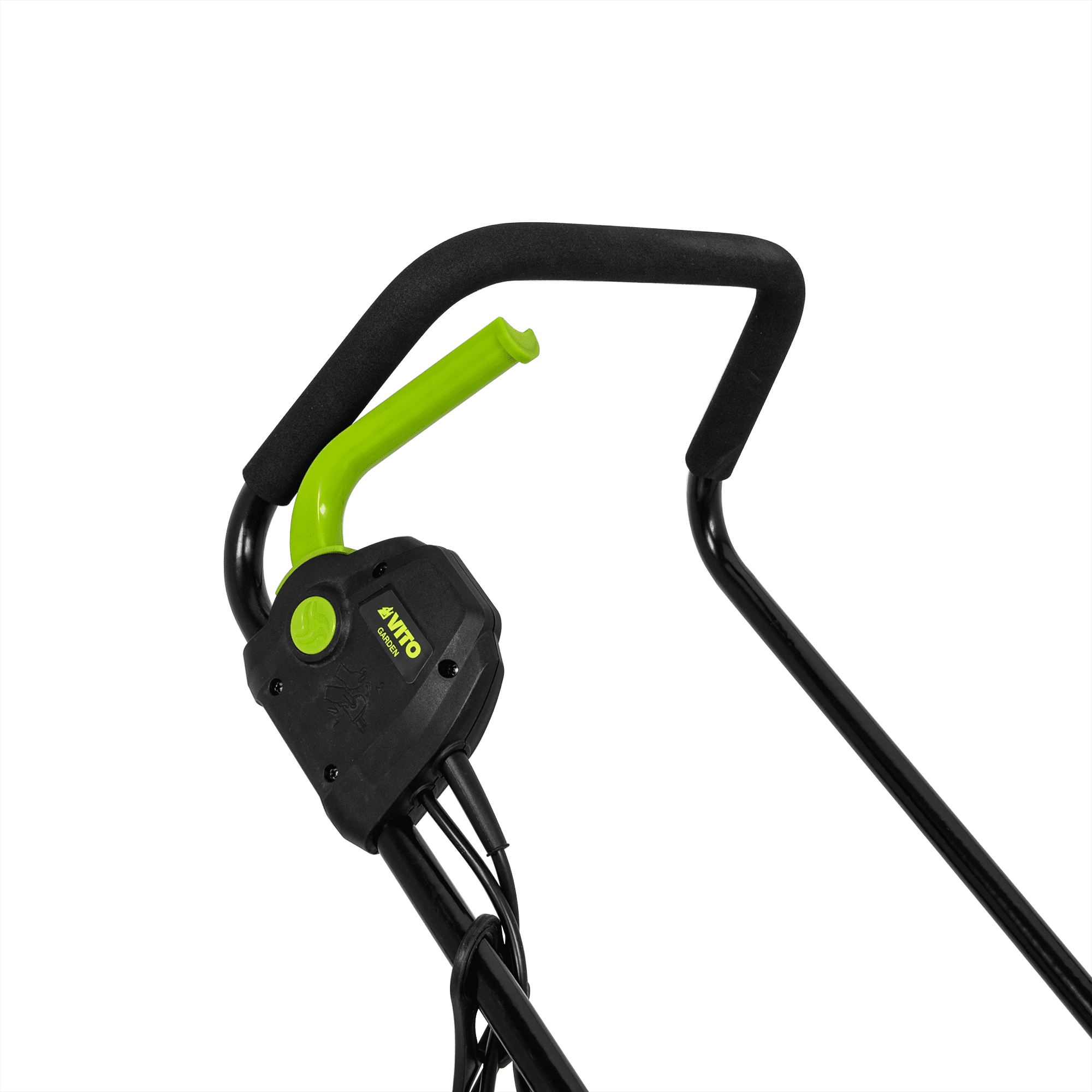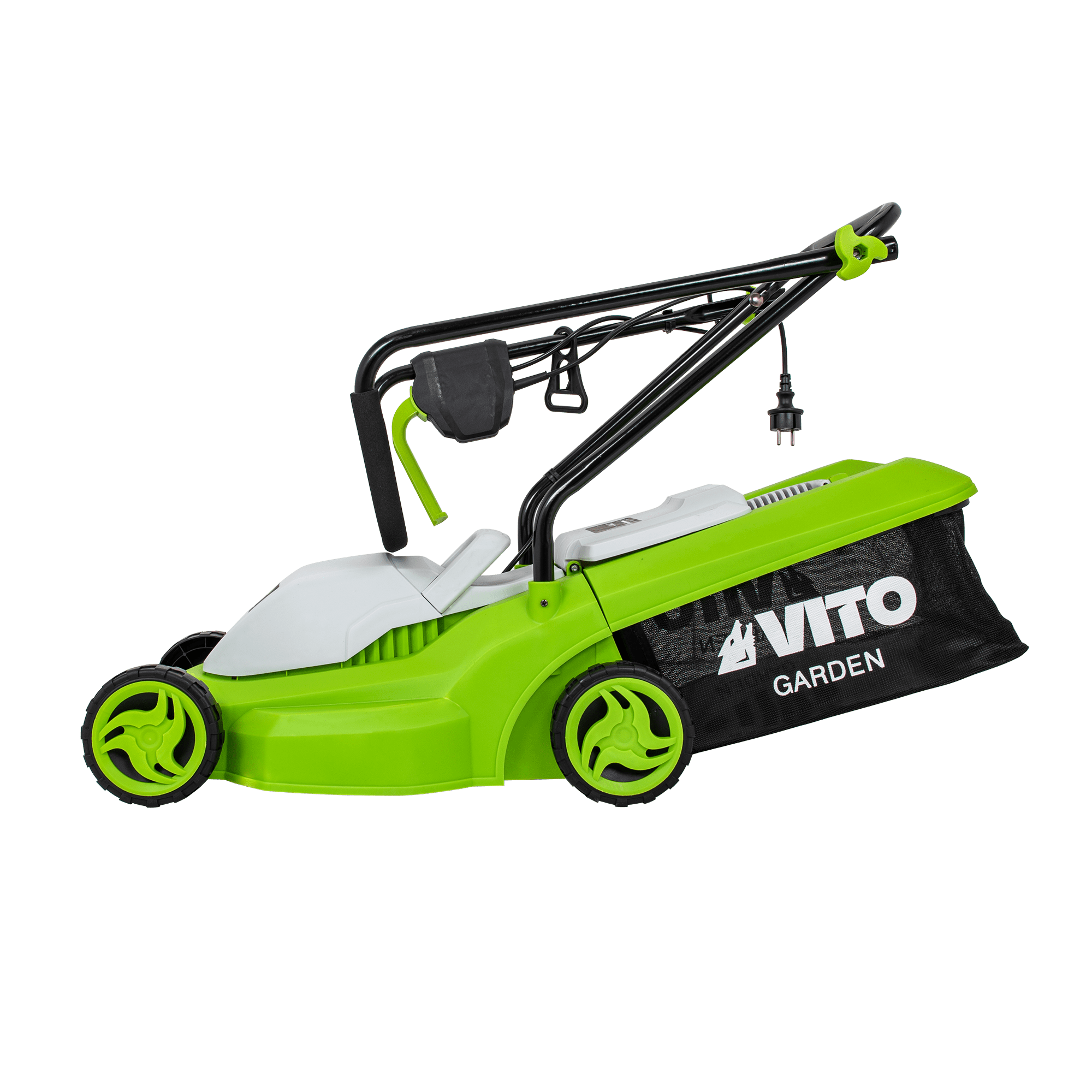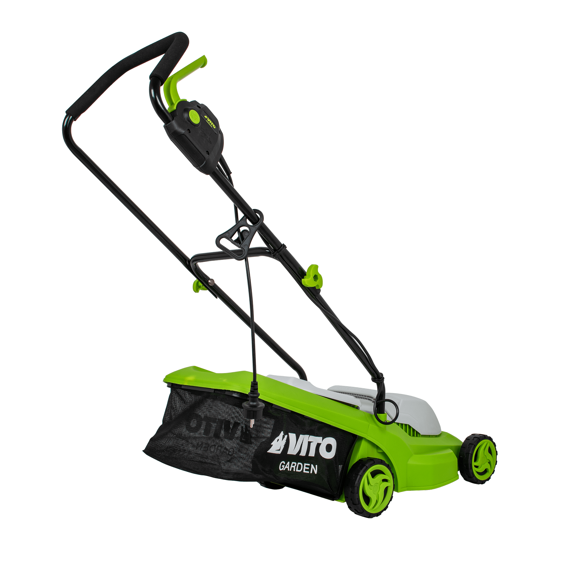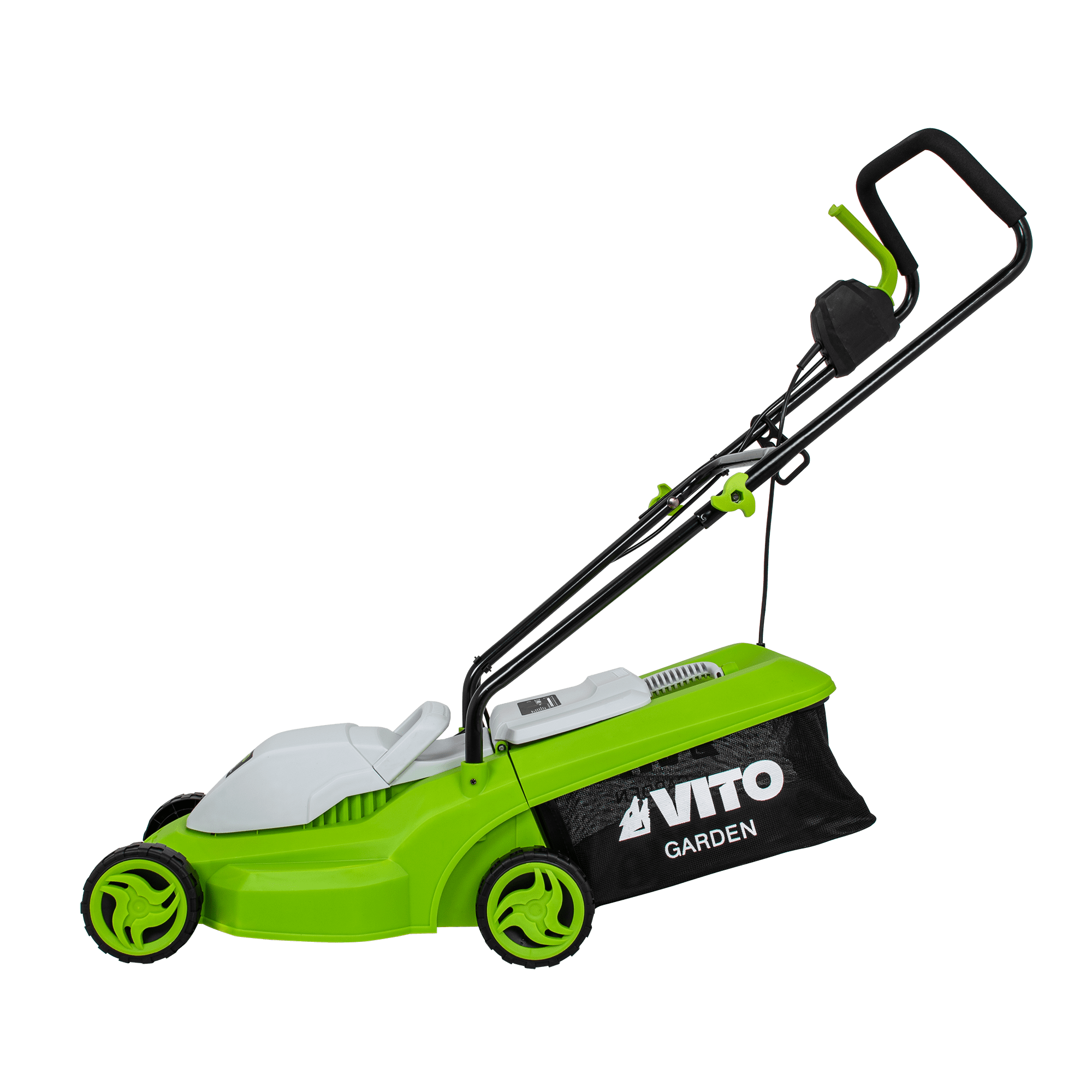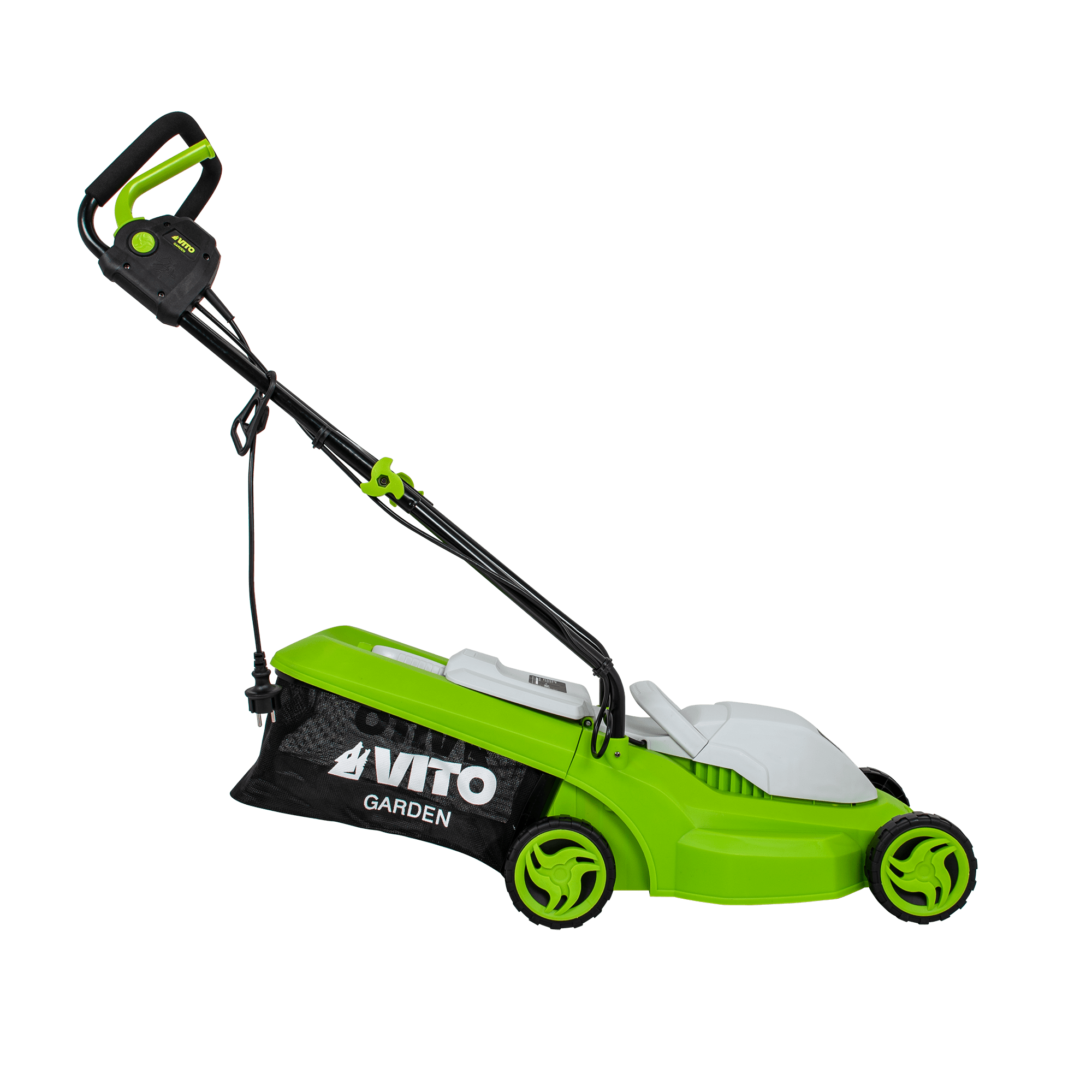 Máquina de Cortar Relva com uma potência de 1200W, com uma tensão de 230V 50Hz, tem um motor de indução, com uma rotação de 2800rpm, 320mm de diâmetro de corte, tem 3 níveis de corte 25 - 60mm, rodas com um diâmetro de 130mm, Máquina de Cortar Relva com uma capacidade de 30L.