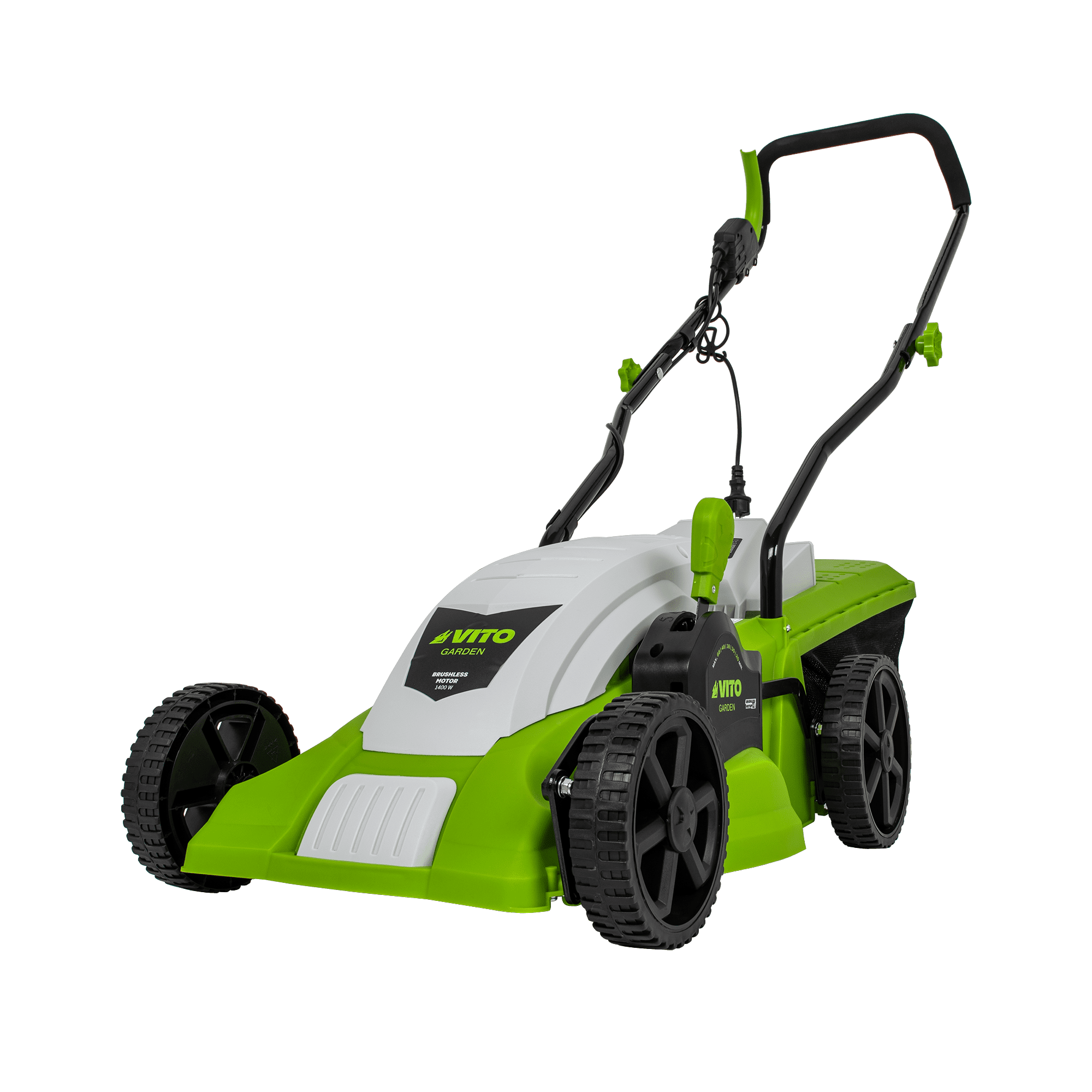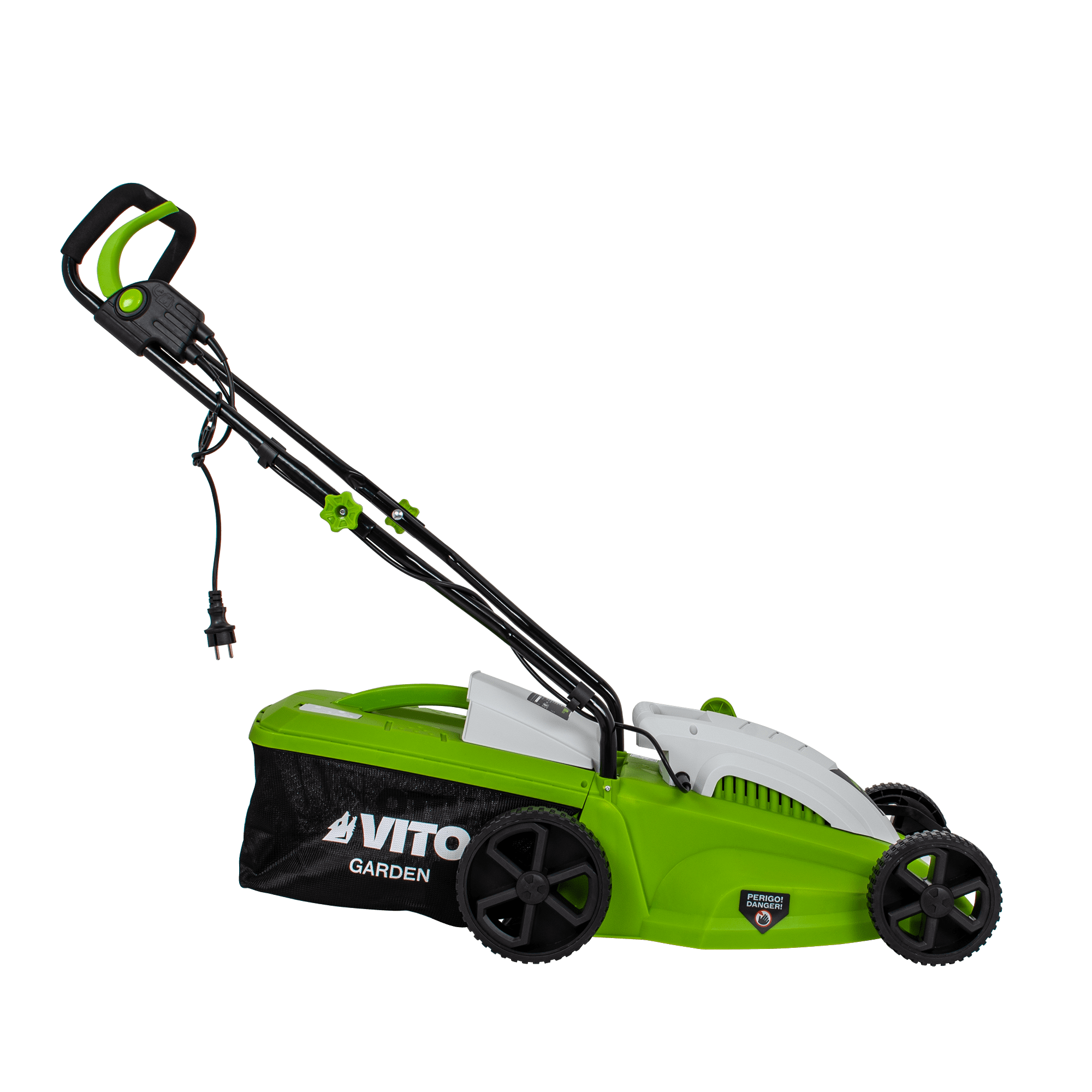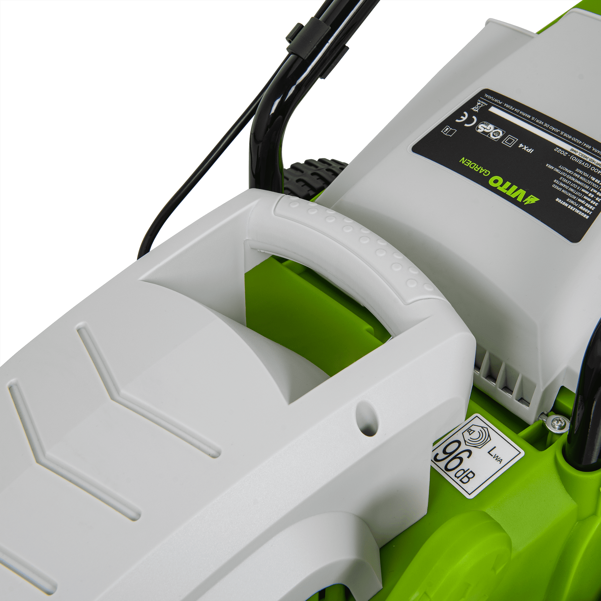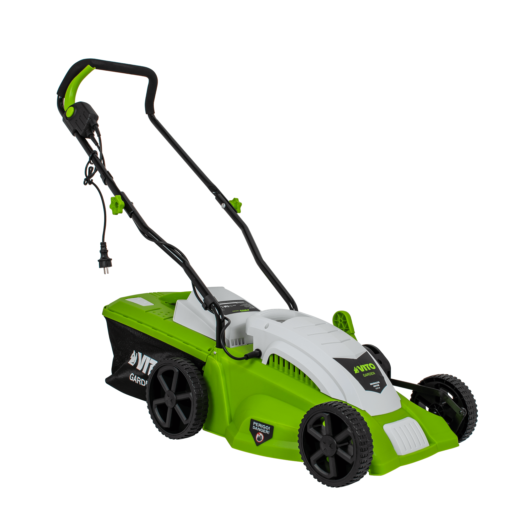 Máquina de Cortar Relva com uma potência de 1400W, com uma voltagem de 230V 50Hz, tem um motor de indução, com uma rotação de 2850rpm, 340mm de diâmetro de corte, tem 5 níveis de corte 20 - 60mm, rodas com um diâmetro de 170 - 200mm, máquina de Cortar Relva com uma capacidade de 35L.