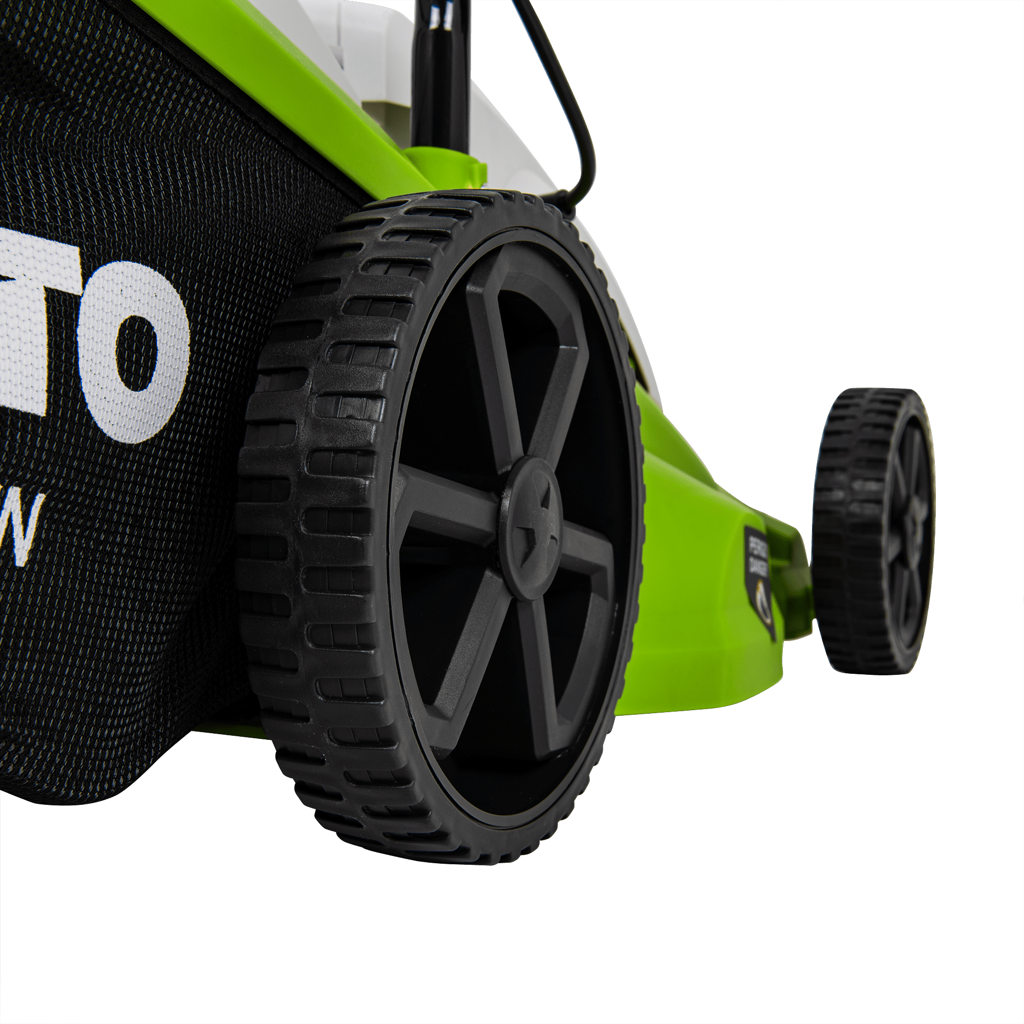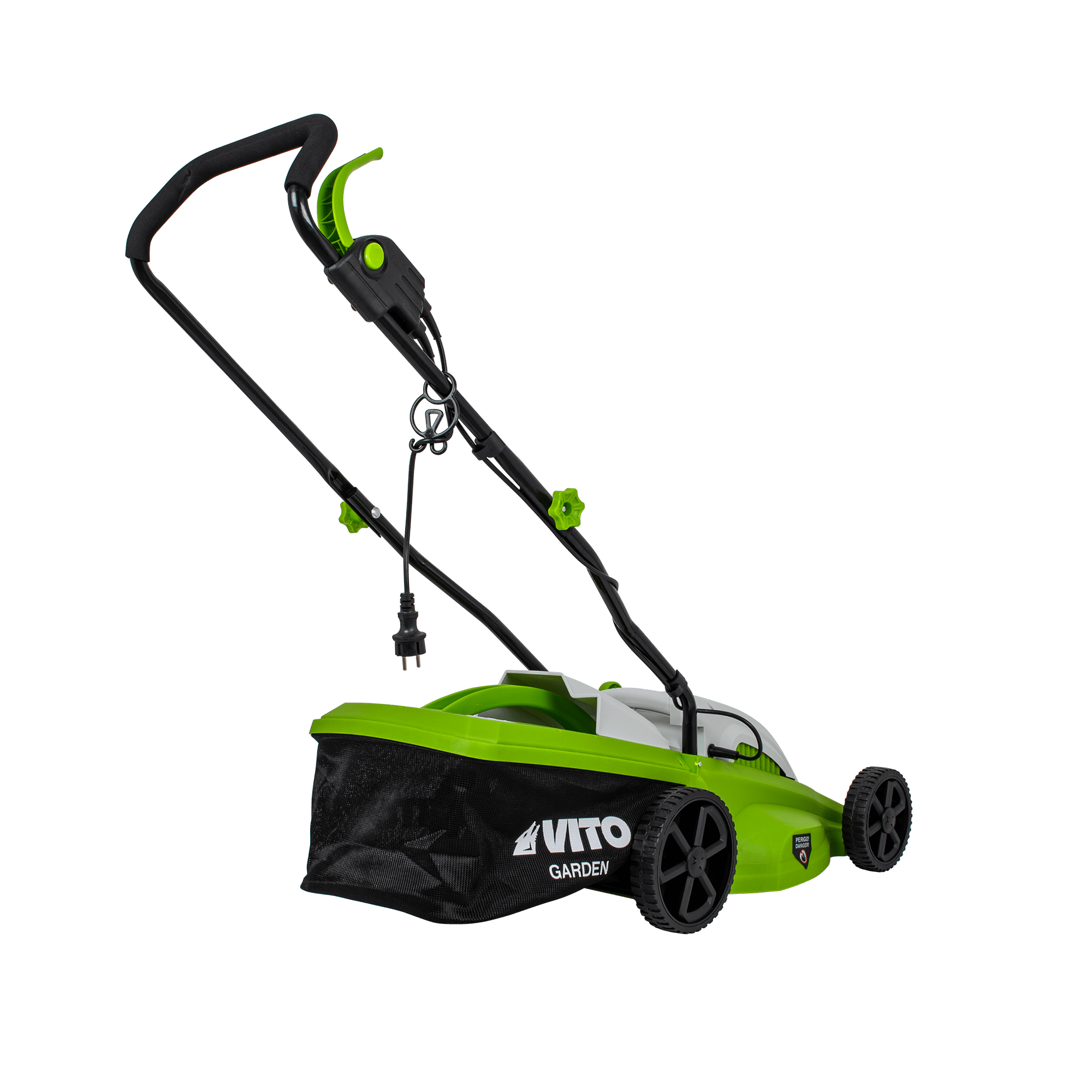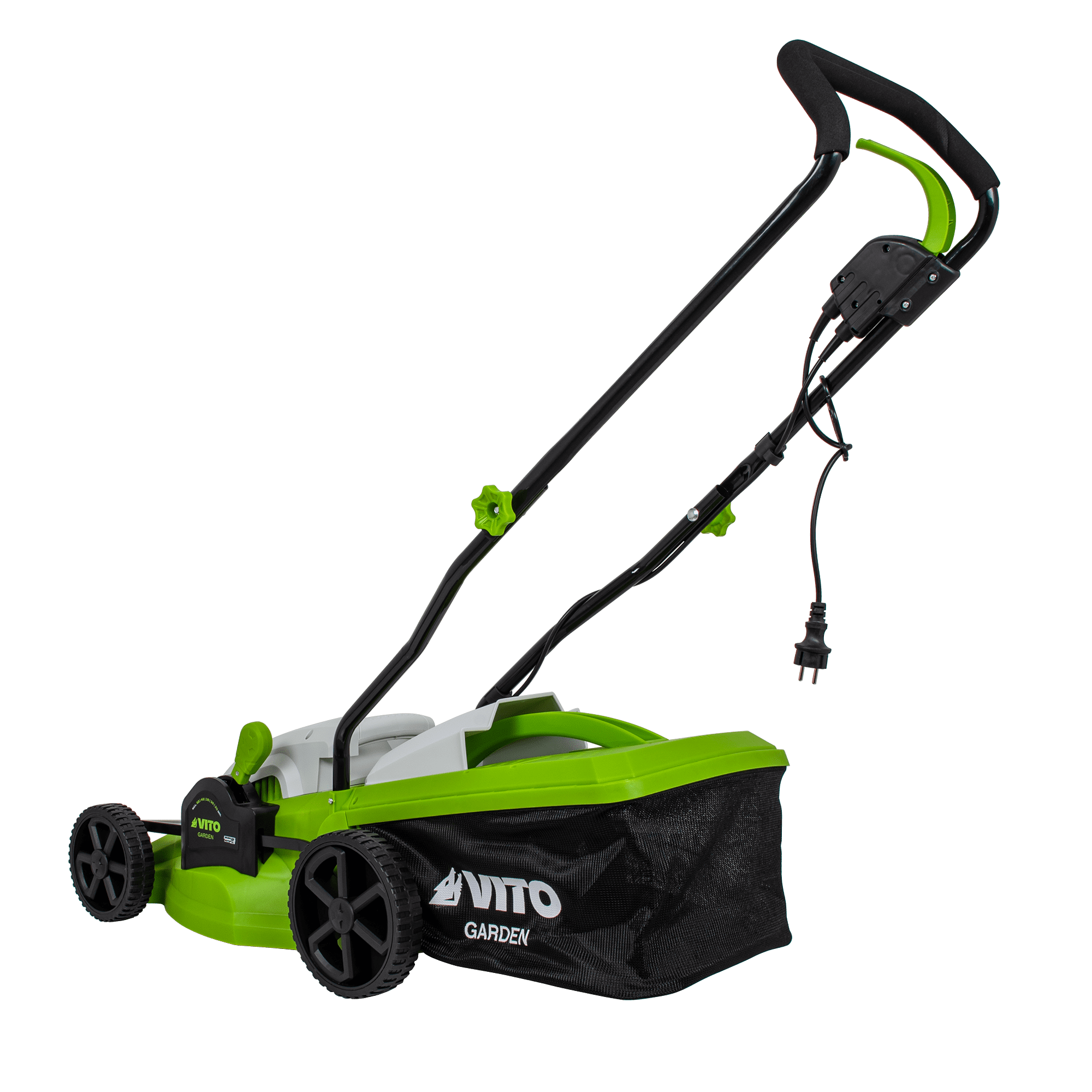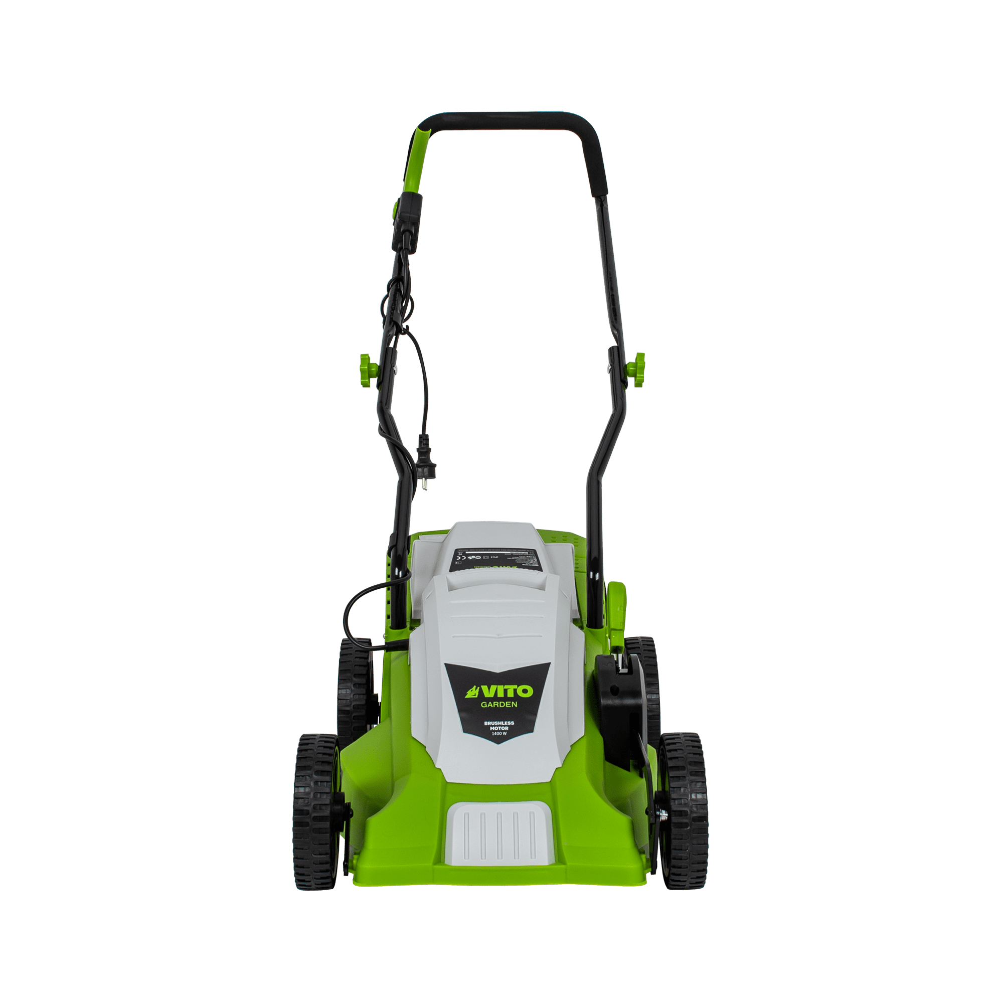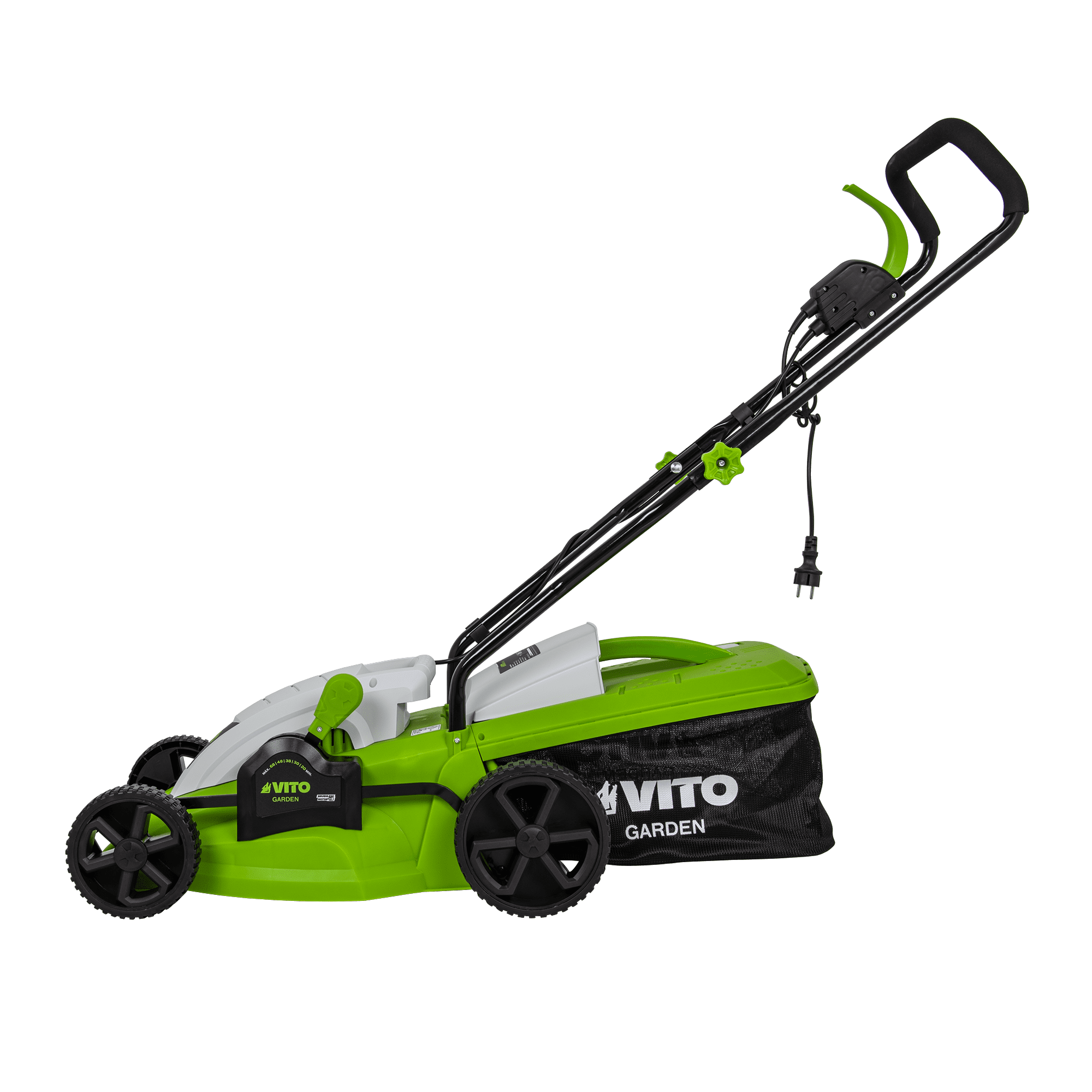 Máquina de Cortar Relva com uma potência de 1400W, com uma voltagem de 230V 50Hz, tem um motor de indução, com uma rotação de 2850rpm, 340mm de diâmetro de corte, tem 5 níveis de corte 20 - 60mm, rodas com um diâmetro de 170 - 200mm, máquina de Cortar Relva com uma capacidade de 35L.