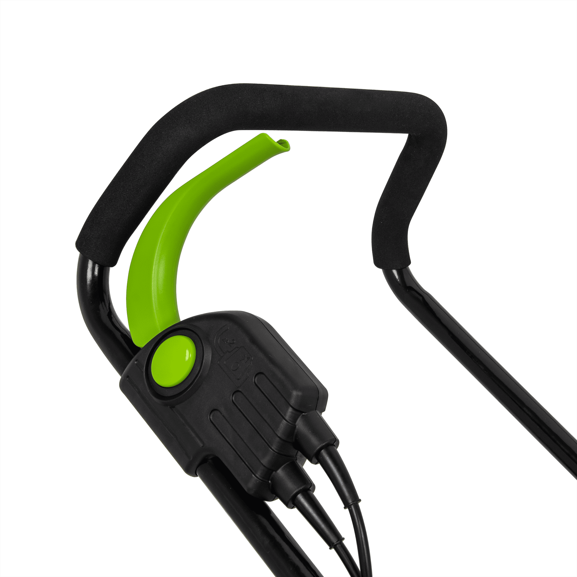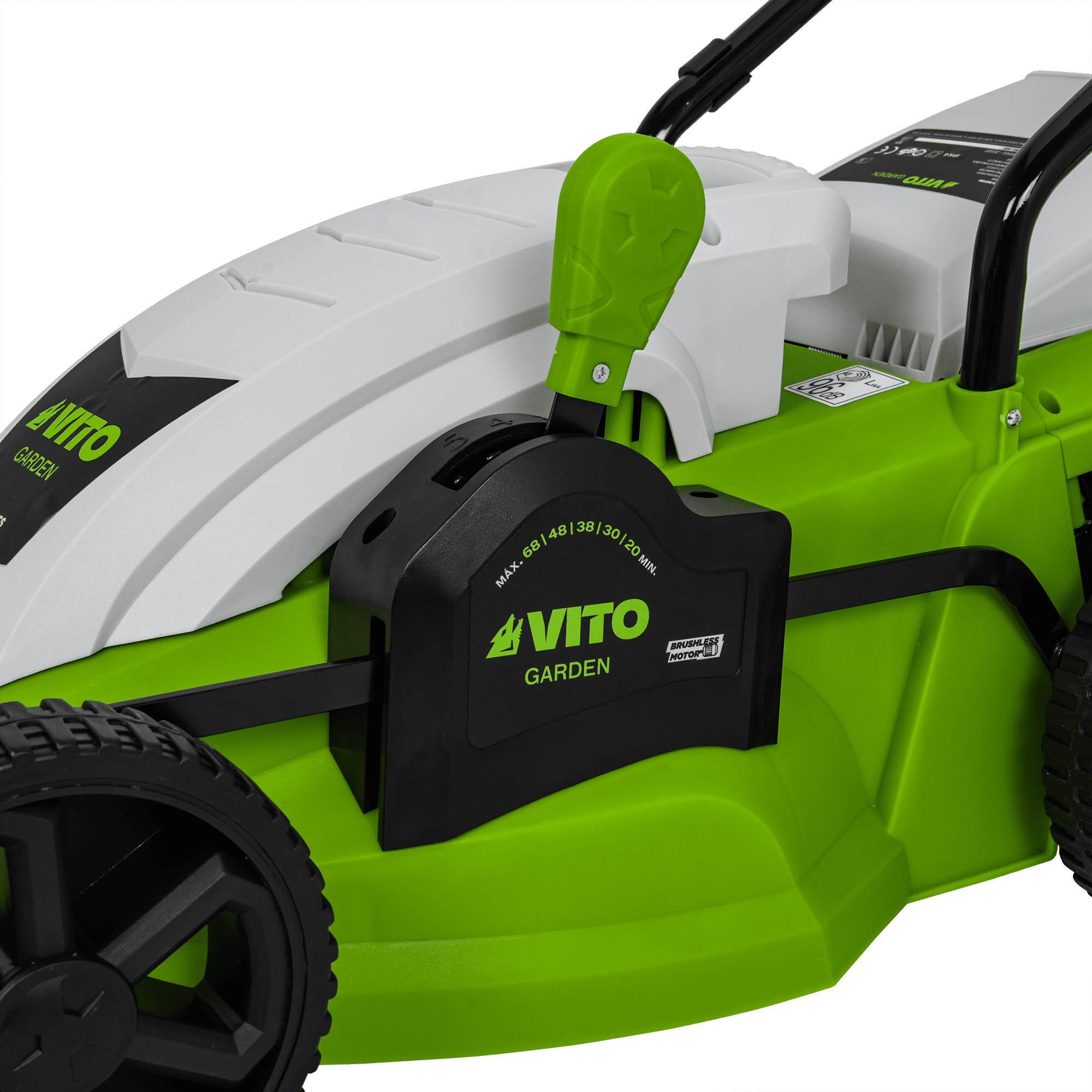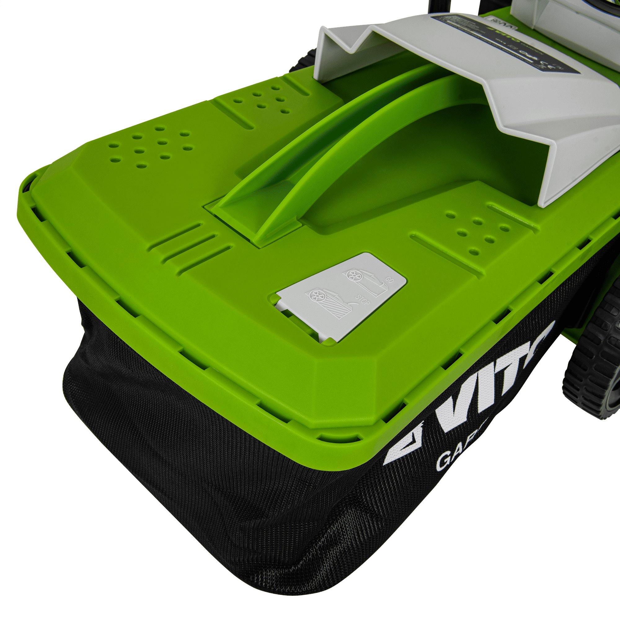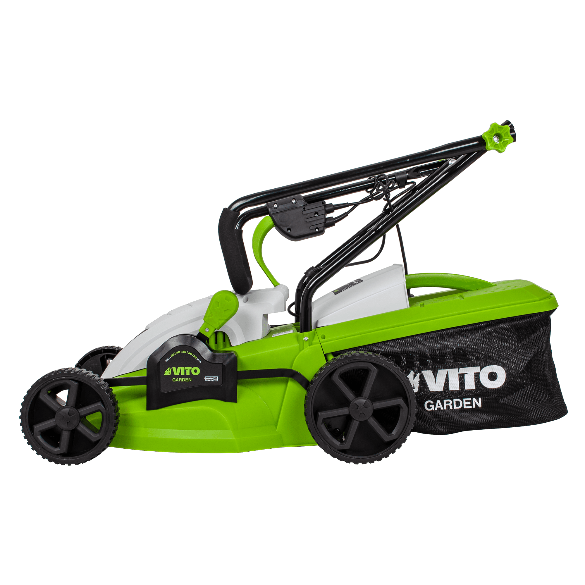 Máquina de Cortar Relva com uma potência de 1400W, com uma voltagem de 230V 50Hz, tem um motor de indução, com uma rotação de 2850rpm, 340mm de diâmetro de corte, tem 5 níveis de corte 20 - 60mm, rodas com um diâmetro de 170 - 200mm, máquina de Cortar Relva com uma capacidade de 35L.