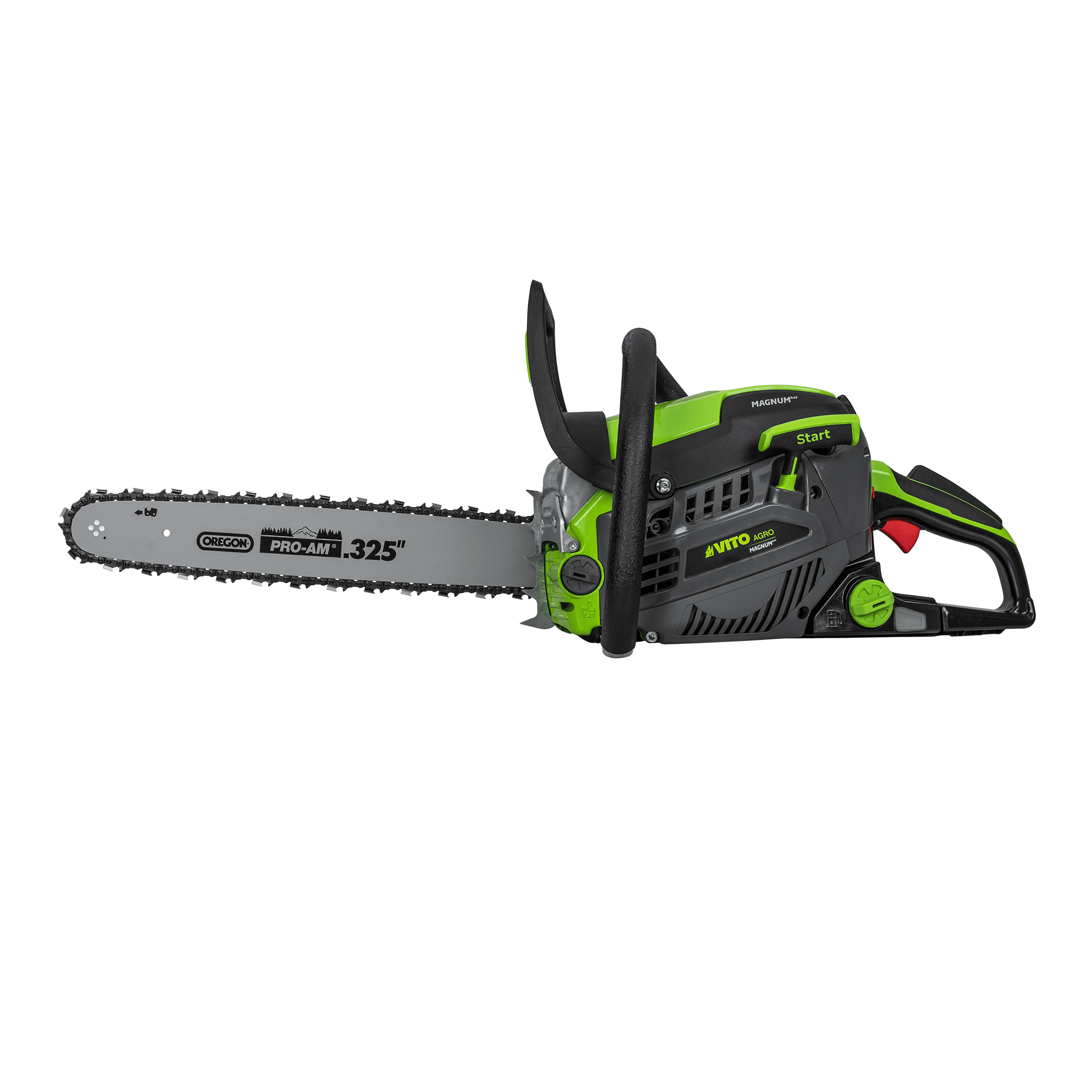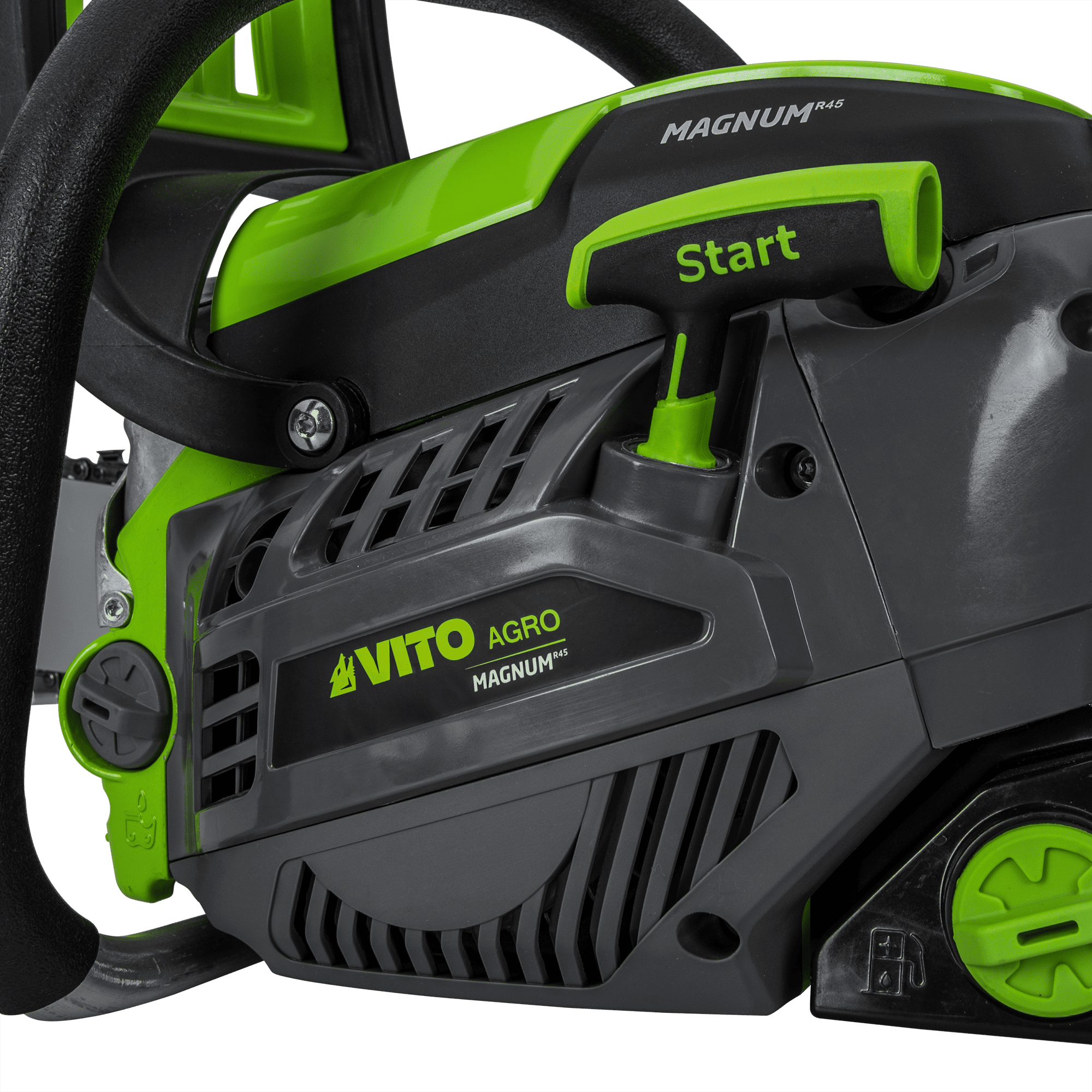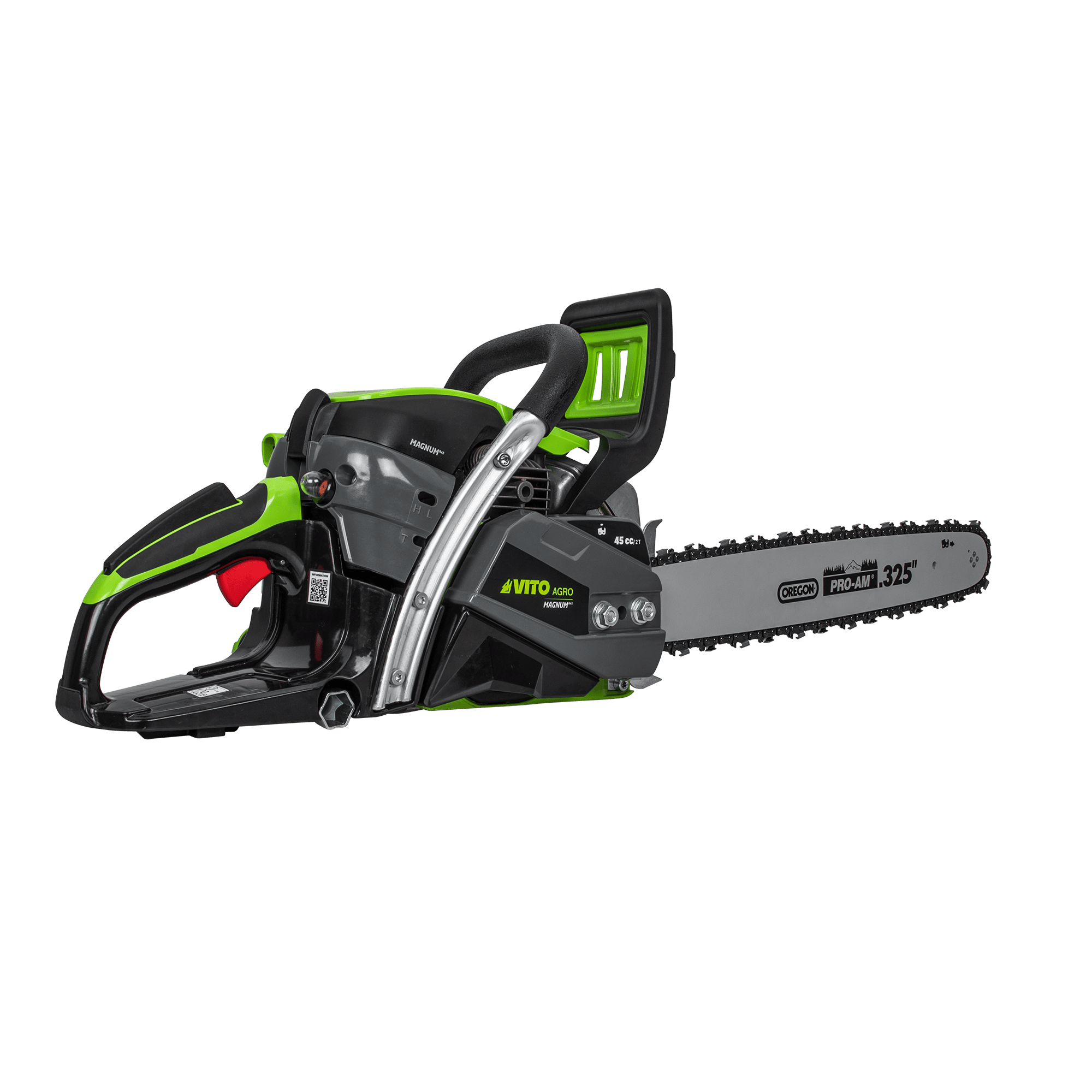 A Motosserra 45cc VITO da gama MAGNUM é ideal para tarefas de poda de galhos, corte de arbustos e árvores de médio porte. Indicada para trabalhos de florestação de média escala, é apropriada para a manutenção de terrenos e operações de corte mais exigentes. Equipada com uma lâmina de 450mm de alta qualidade da Oregon e uma corrente de 72 elos, destaca-se pela durabilidade e resistência ao desgaste, assegurando um corte eficaz e consistente. A bomba do carburador Walbro garante uma operação fiável e a regulação fácil do óleo permite ajustar o fluxo de lubrificação. Com sistema anti-vibração e punho suave, este modelo oferece uma experiência de utilização ergonómica, minimizando o cansaço e permitindo um controlo mais preciso durante o trabalho. Além disso, vem acompanhada de uma corrente de reposição, proteção para a lâmina, chave de velas e lima, tudo o que necessita para a sua manutenção e longevidade.