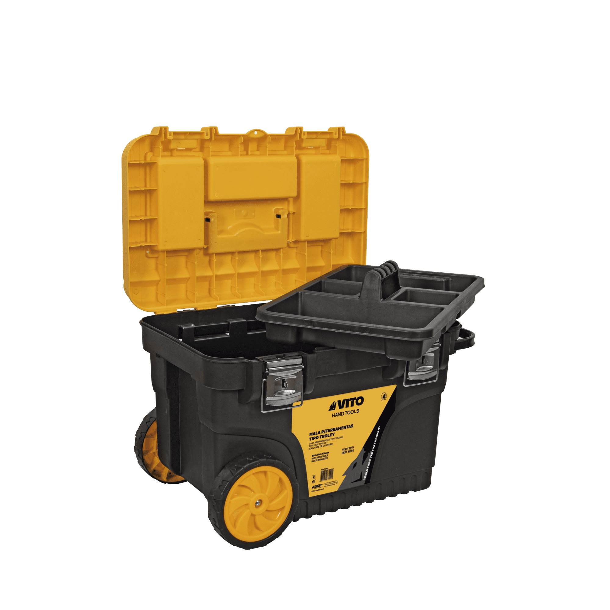 Mala para Ferramentas tipo Trolley, equipada com pega retráctil e telescópica, contém tabuleiro para ferramenta amovível, possui 1 compartimento na tampa, tem fechos metálicos resistentes e um fecho por cadeado (não incluído), tem ainda umas rodas grandes revestidas a borracha.