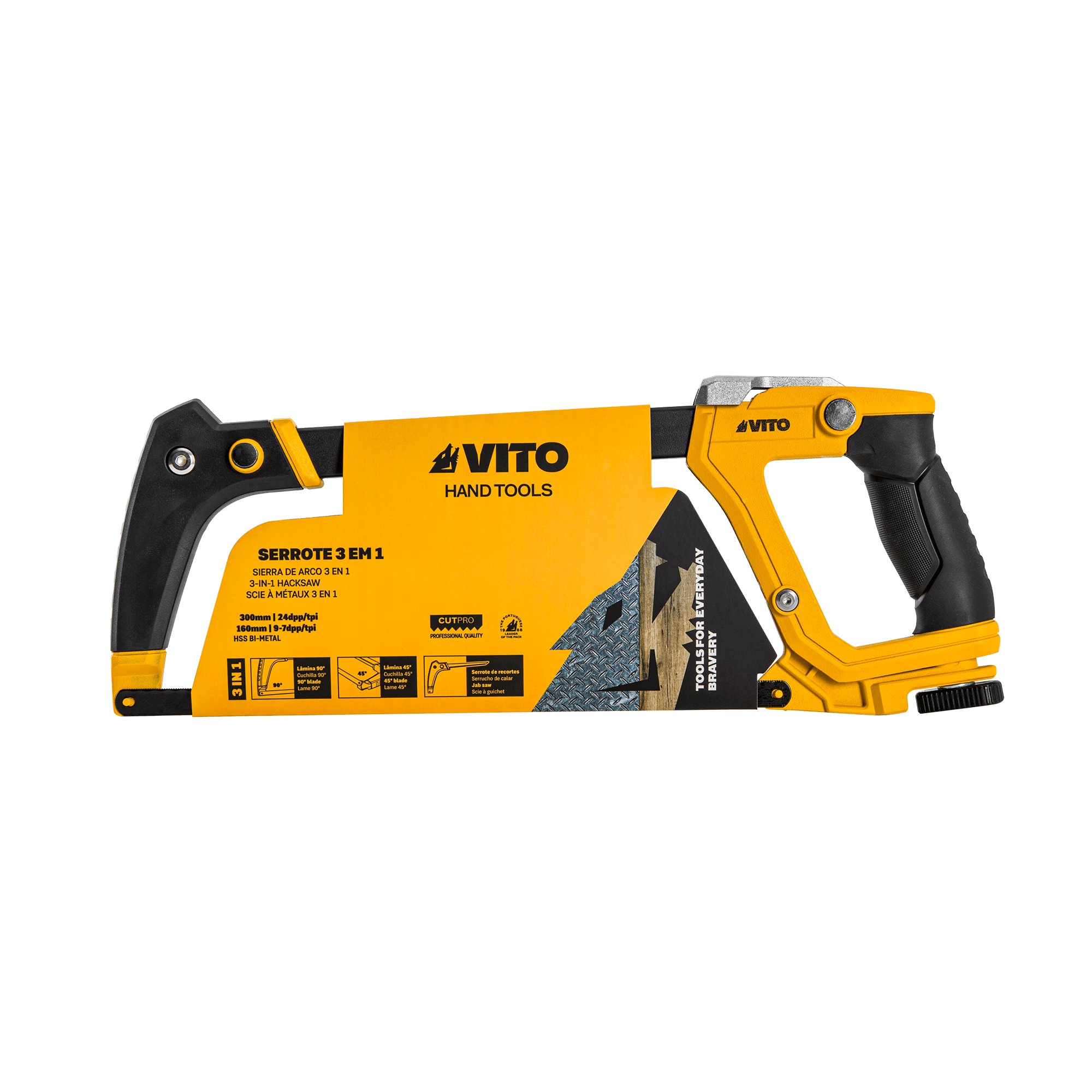 O Serrote 3 em 1 da VITO (VIS3E1) é indicado para realizar cortes versáteis a 45º e 90º, sendo ainda possível transformá-lo em serrote de recortes para maior praticidade. Esta ferramenta multifunções apresenta dois modos de utilização: serrote de corte de ferro e serrote de recortes. A primeira opção, indicada para o corte de ferro, destaca-se por permitir a realização de cortes a 45º e 90º. Já o serrote de recortes, ideal para o corte de madeira, pladur e plástico, caracteriza-se pelo seu porte de menor dimensão que garante um maior controlo sob a tarefa a ser executada. Para além disto, o serrote está equipado com um tensor que possibilita a regulação da tensão da lâmina, sendo possível ajustar a mesma. Em termos ergonómicos, a ferramenta inclui um cabo em borracha que aumenta o conforto do utilizador e ajuda a reduzir a fadiga do mesmo.