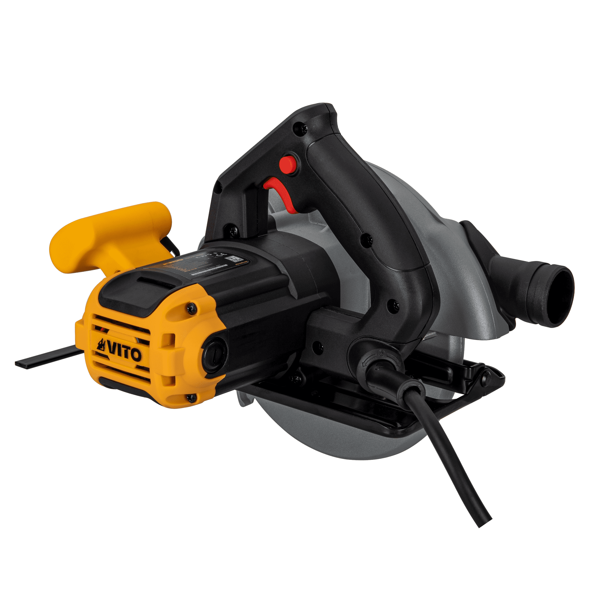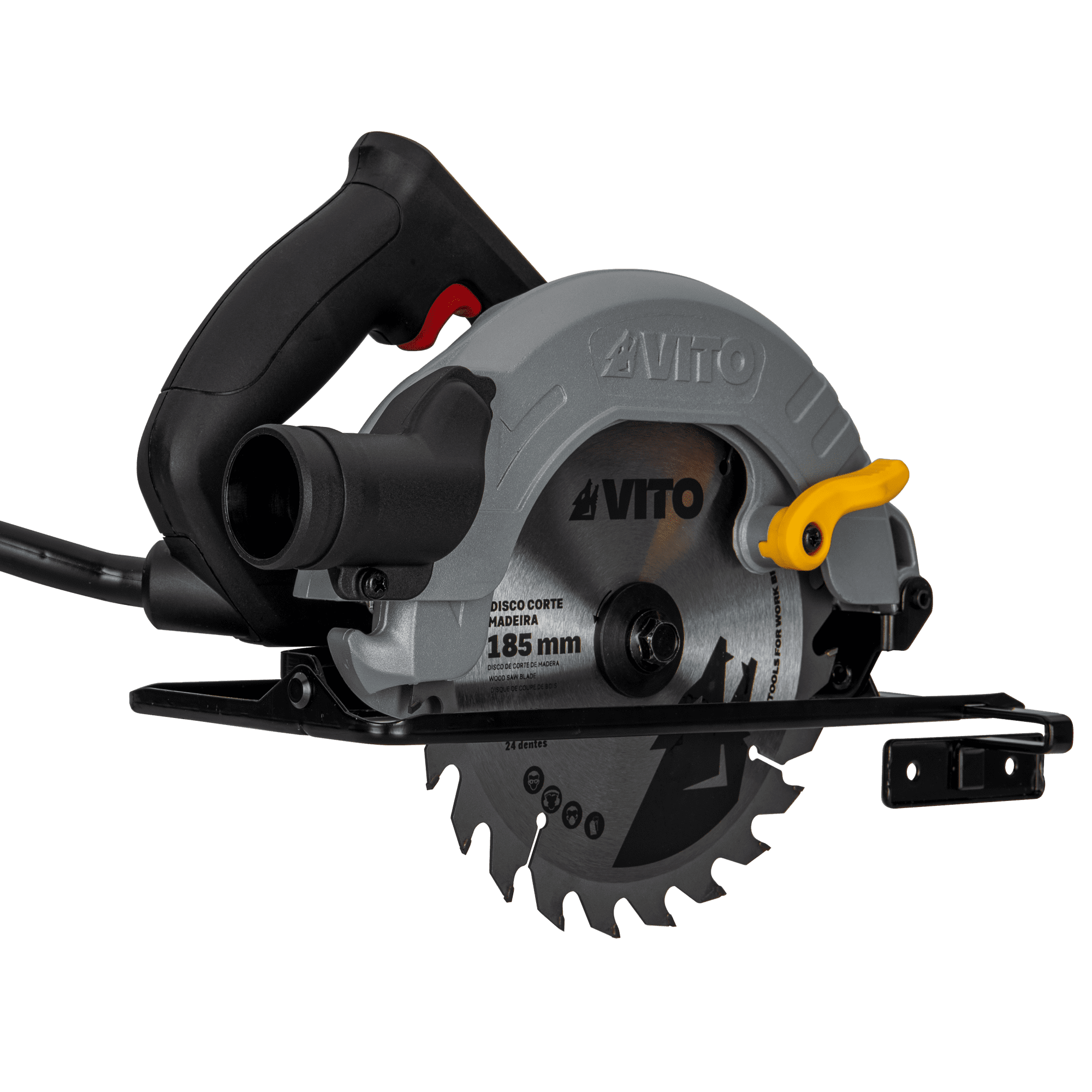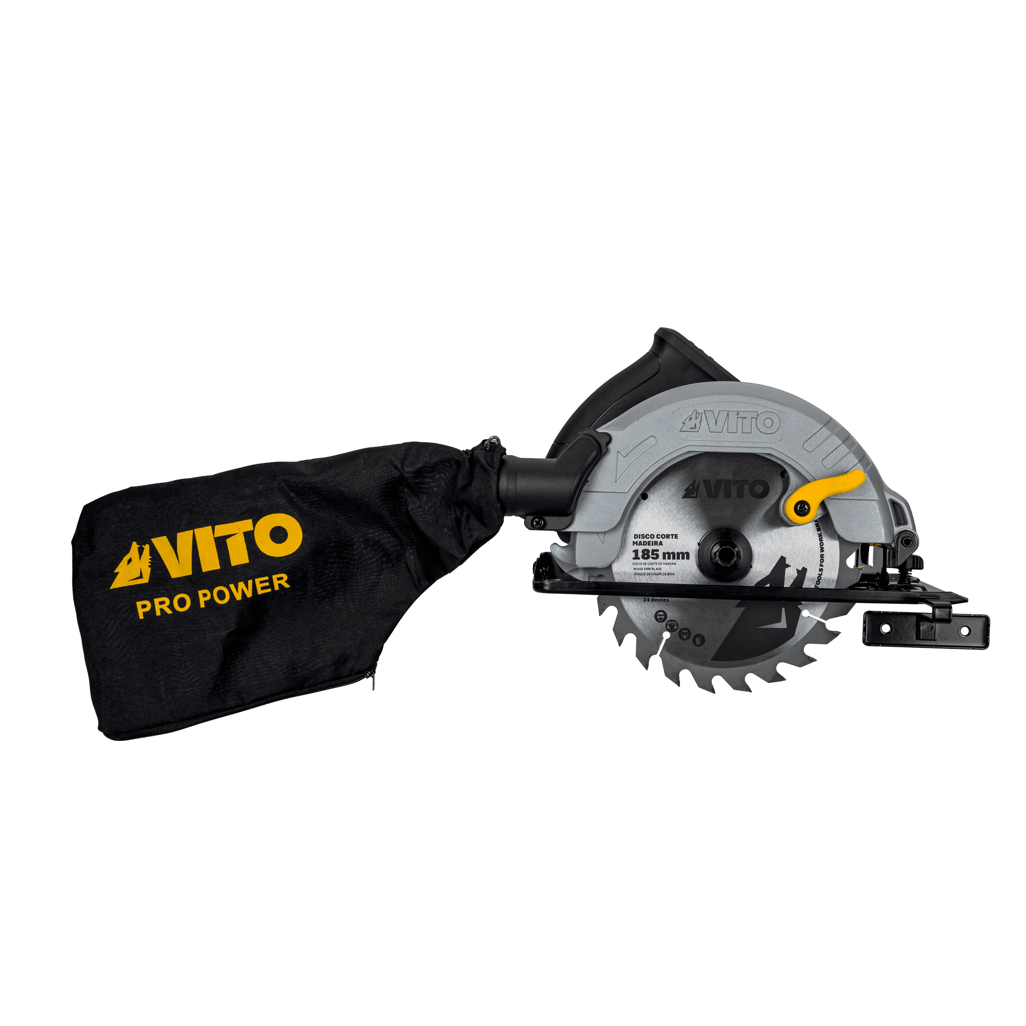Serra Circular 1500W VITO com uma capacidade de corte até 65mm, é indicada para cortes retos e cortes em esquadria, desde madeira, plástico e materiais semelhantes. Inclui uma guia de corte em paralelo, um disco de corte de madeira com 185mm e uma chave hexagonal para permitir uma mudança simples e segura do disco. Contém ainda, um saco coletor de pó e aparas, protegendo o utilizador, mantendo um ambiente de trabalho limpo. Esta serra tem como vantagem, a ligação a sistemas de aspiração, utilizando o adaptador já incluído no aspirador VITO (VIASL40). Prática e de fácil utilização, esta ferramenta dispõe ainda de um punho ergonómico.