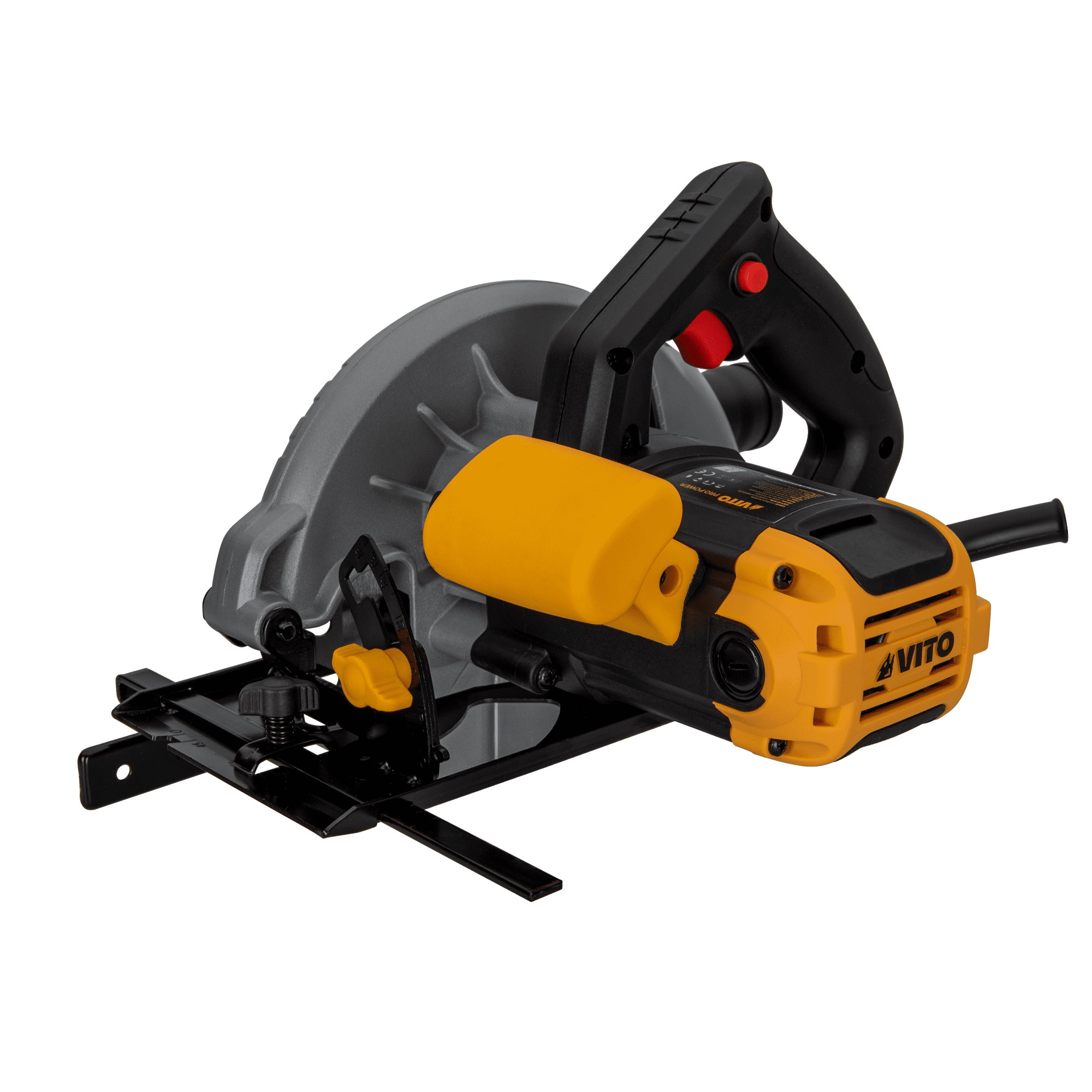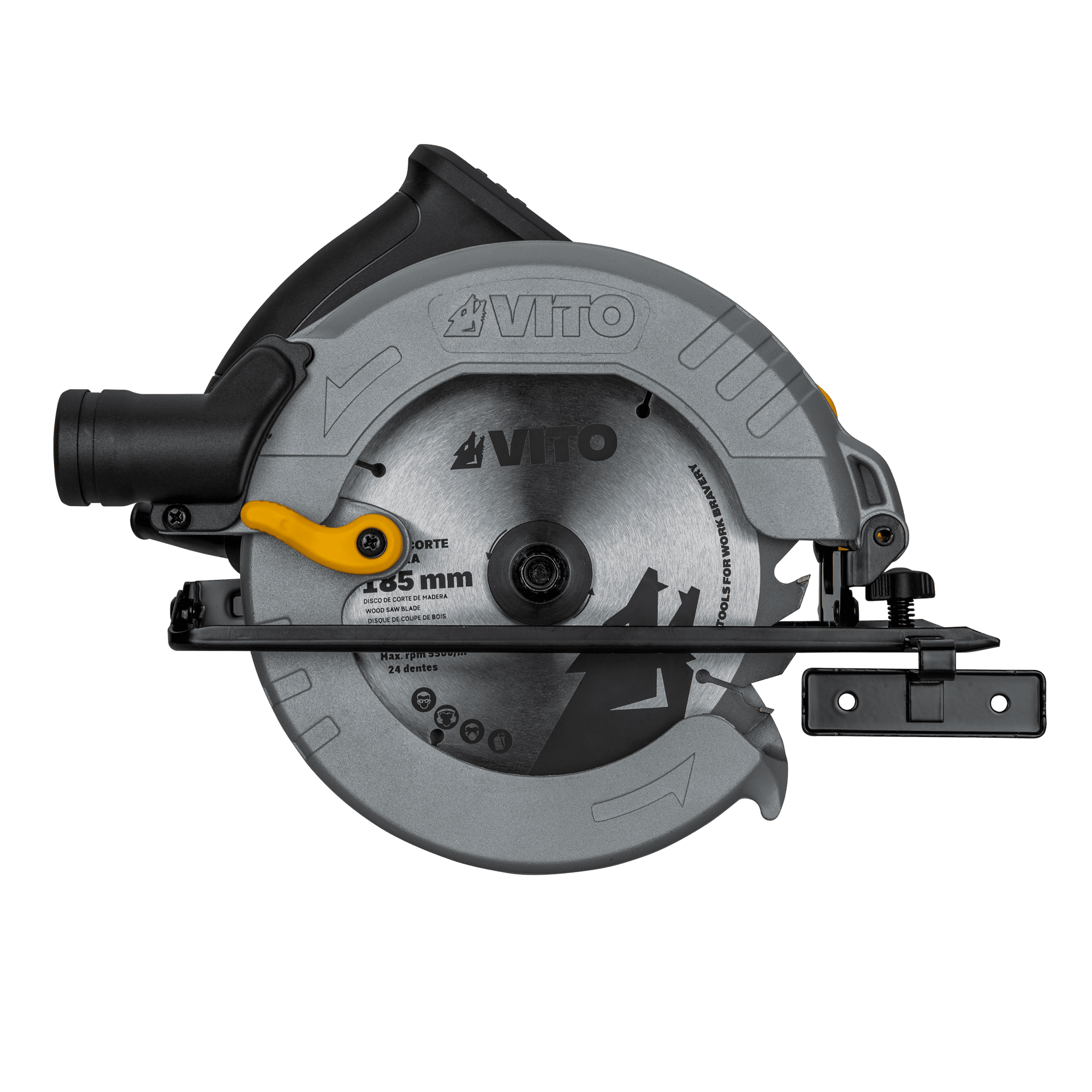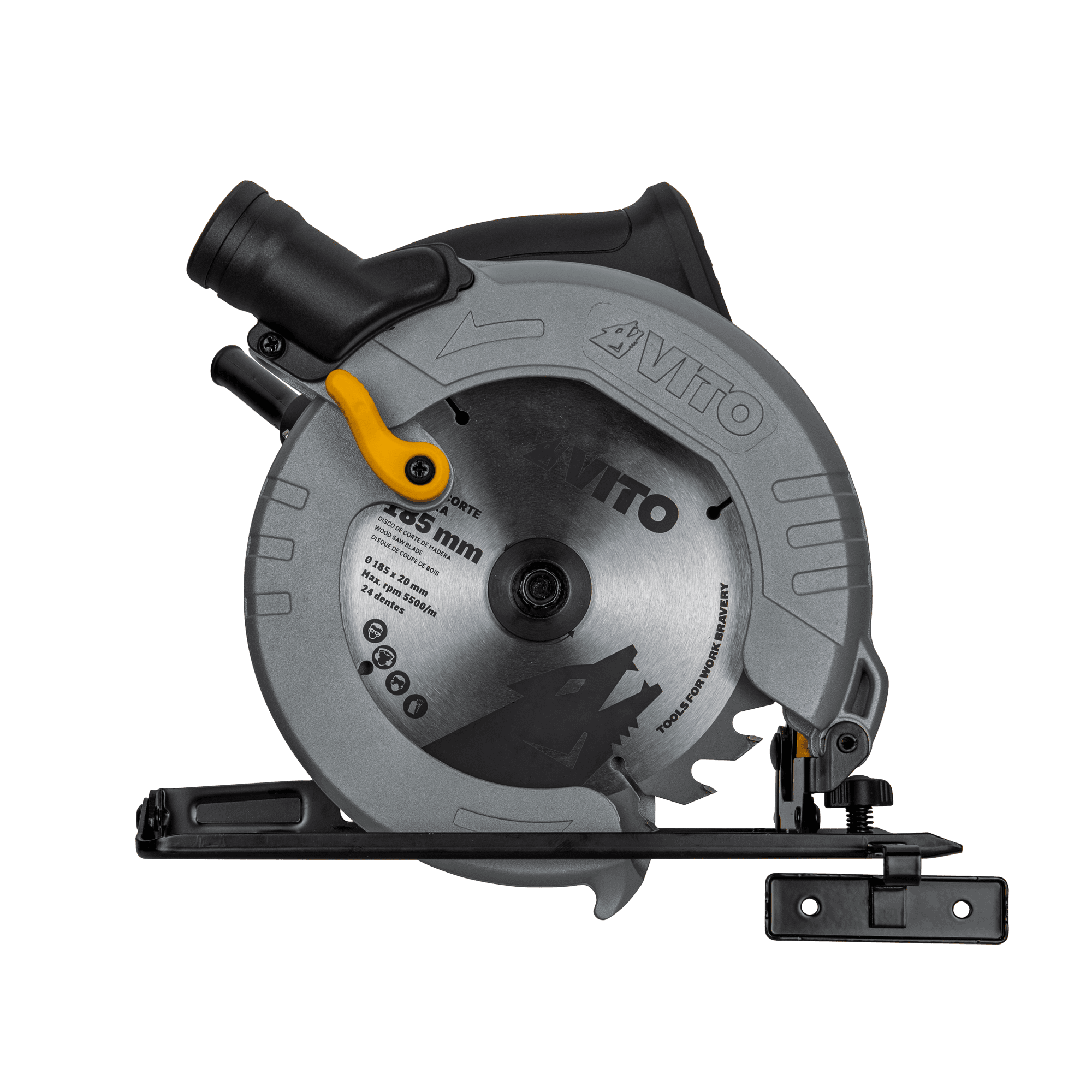Serra Circular 1500W VITO com uma capacidade de corte até 65mm, é indicada para cortes retos e cortes em esquadria, desde madeira, plástico e materiais semelhantes. Inclui uma guia de corte em paralelo, um disco de corte de madeira com 185mm e uma chave hexagonal para permitir uma mudança simples e segura do disco. Contém ainda, um saco coletor de pó e aparas, protegendo o utilizador, mantendo um ambiente de trabalho limpo. Esta serra tem como vantagem, a ligação a sistemas de aspiração, utilizando o adaptador já incluído no aspirador VITO (VIASL40). Prática e de fácil utilização, esta ferramenta dispõe ainda de um punho ergonómico.