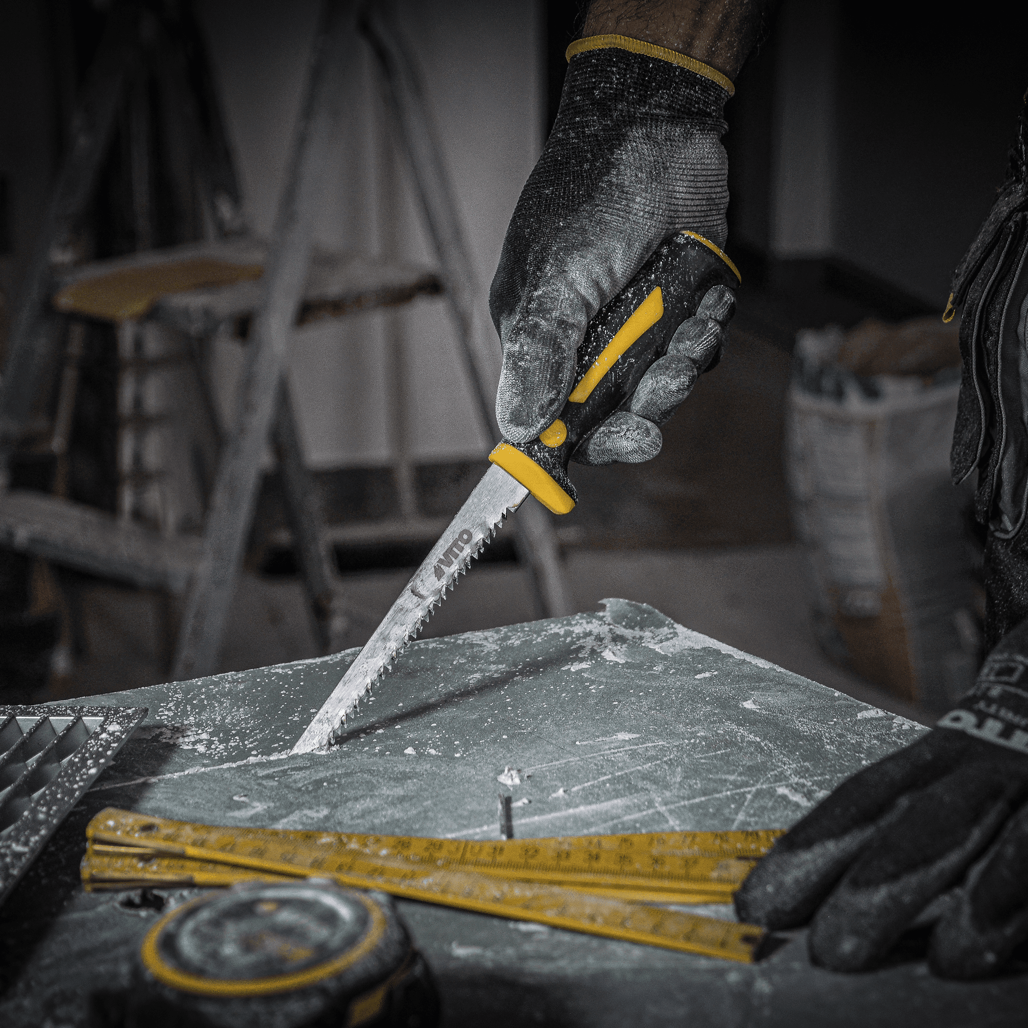 Serrote para Painéis de Gesso com lâmina em aço carbono SK5, tem um cabo revestido a borracha, contêm 7 dentes por polegada com tripla afiação.