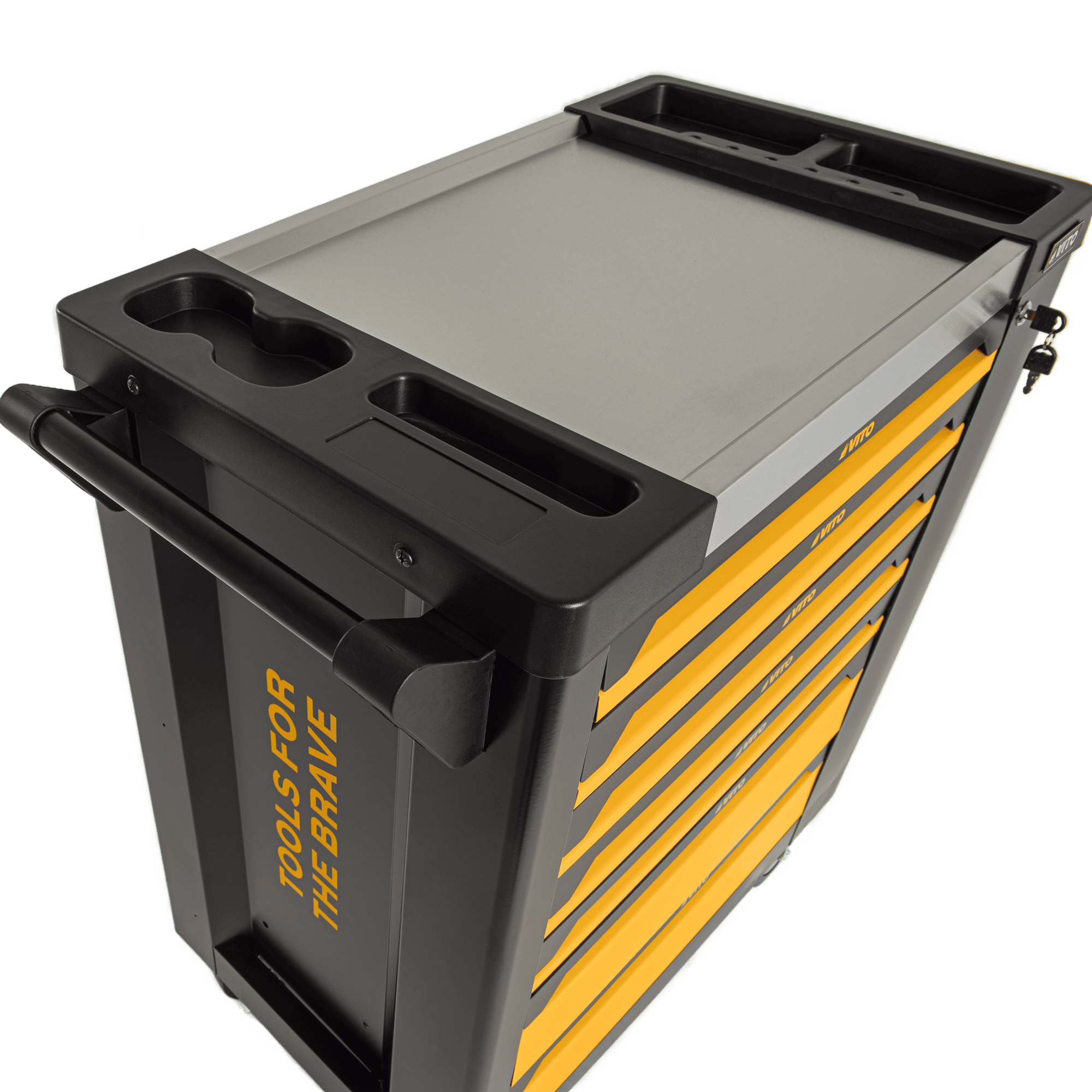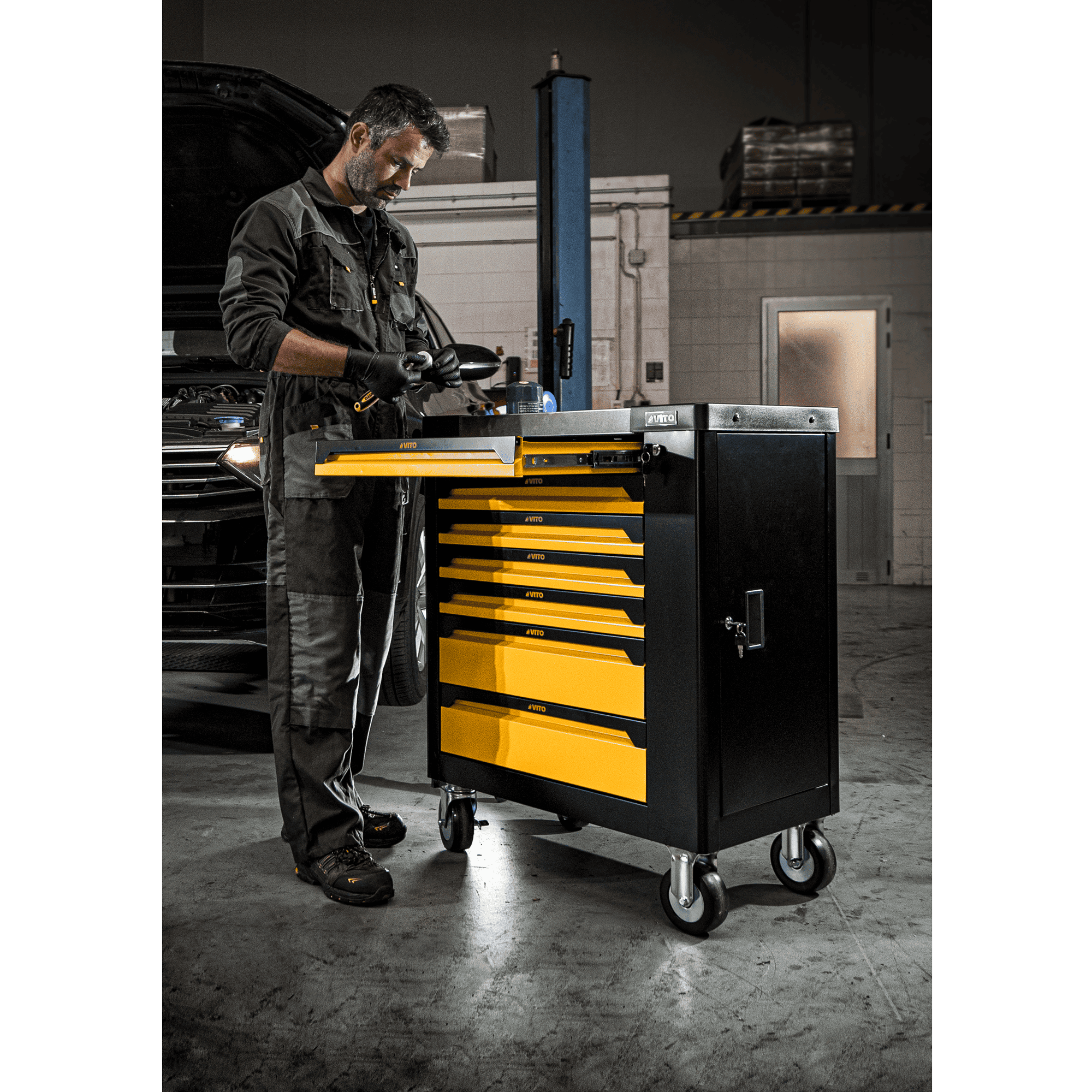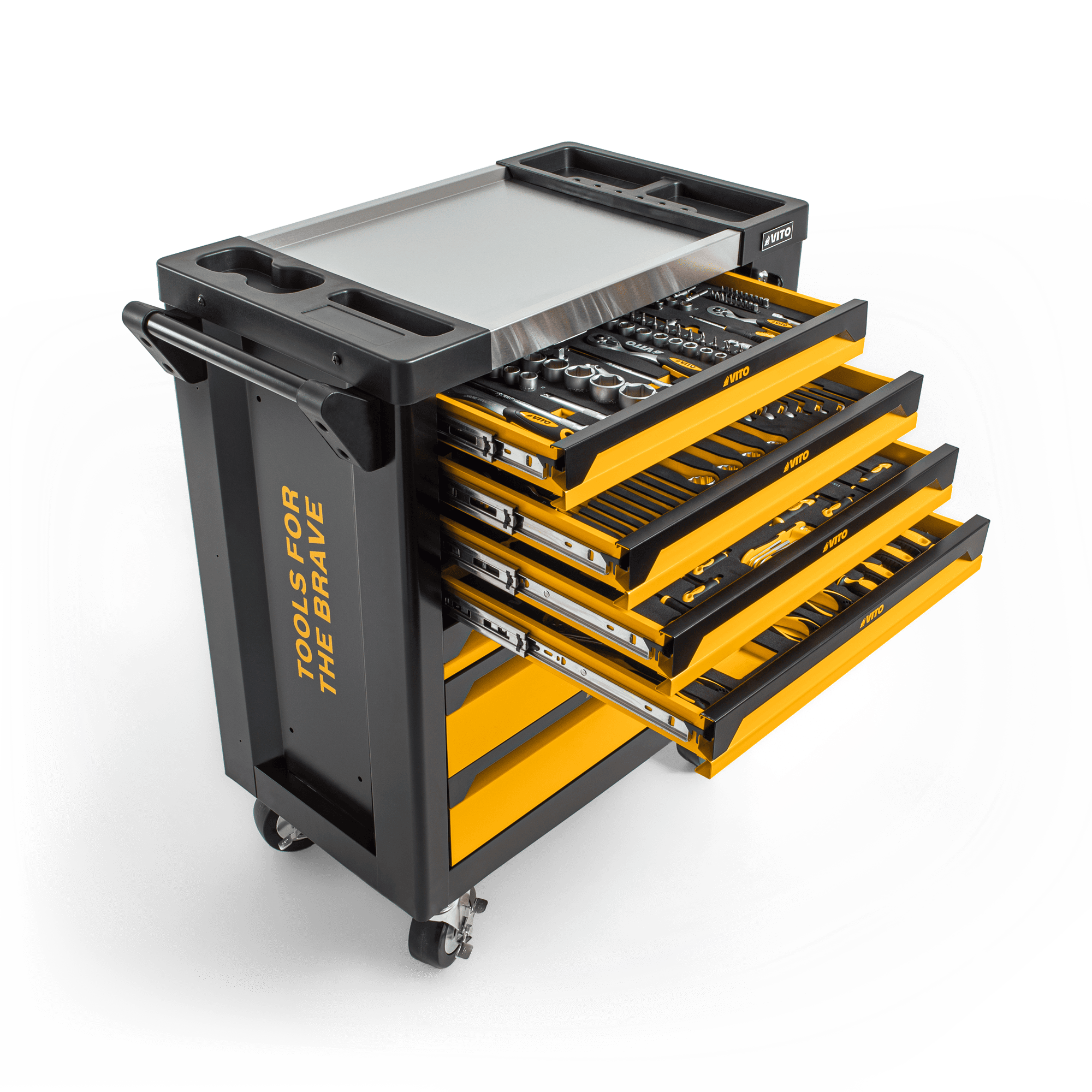 O Trolley da VITO (VITCF7G) vem equipado com um conjunto diversificado de 221 ferramentas de alta qualidade, distribuídas por 5 gavetas, disponibilizando ferramentas necessárias para qualquer projeto. Tem ainda outras 2 gavetas livres e uma porta lateral com fechadura que permite a arrumação de outros objetos ou acessórios. Indispensável para qualquer oficina, garagem ou espaço de trabalho, inclui chaves de fenda, alicates, martelos, chaves de boca e muito mais. O topo deste Trolley, tem uma base resistente em aço inoxidável, permitindo ser utilizado como bancada de trabalho. A superfície das gavetas possui divisórias resistentes a óleos e químicos, permitindo organizar as ferramentas e acessórios de forma segura. Todas as gavetas estão equipadas com guias suaves tendo uma capacidade de carga de 35 kg/45 kg, permitindo o armazenamento de uma variedade de ferramentas sem comprometer a funcionalidade do Trolley. Para garantir a segurança da arrumação e ferramentas, este modelo está equipado com fechadura das gavetas e fechadura da porta lateral com duas chaves cada.