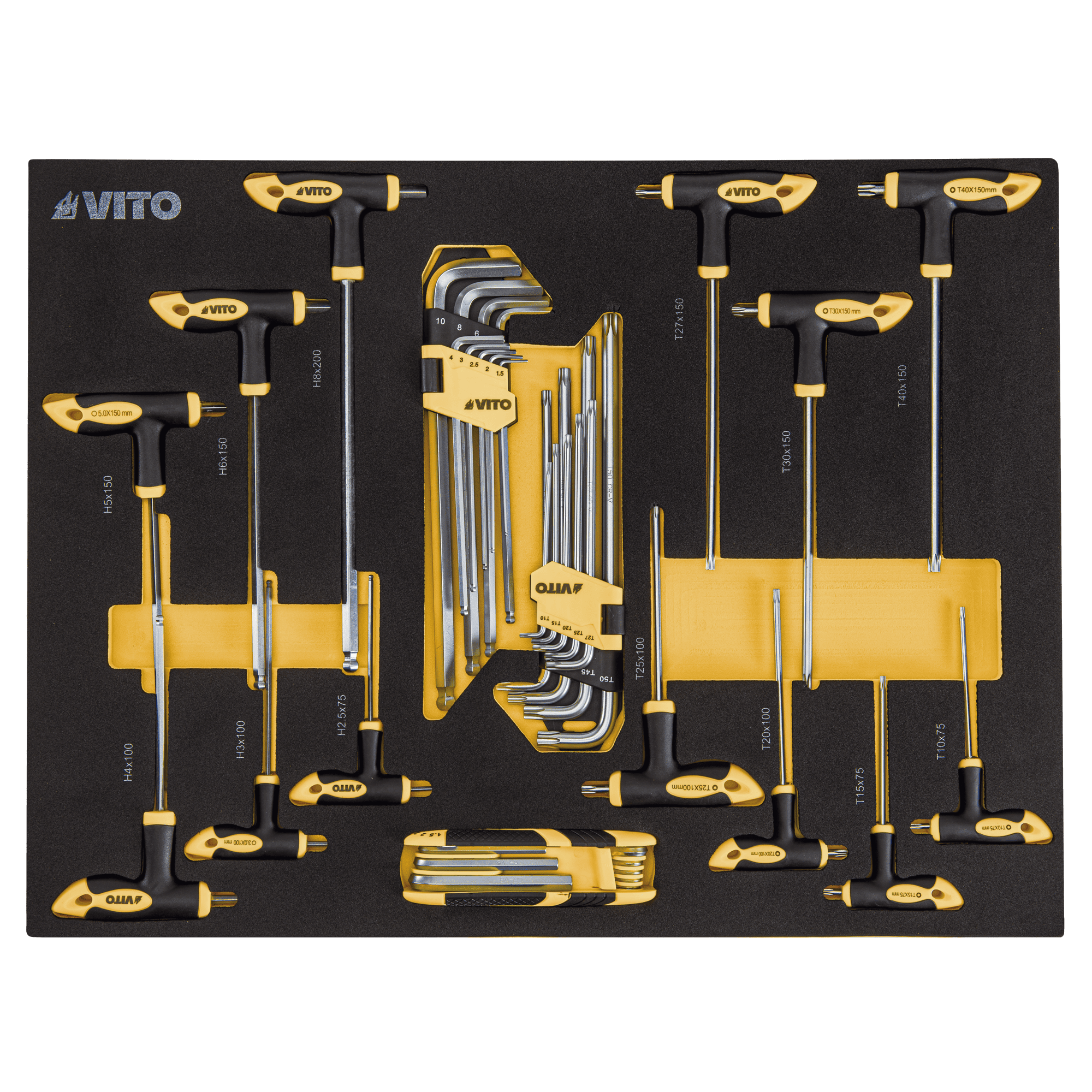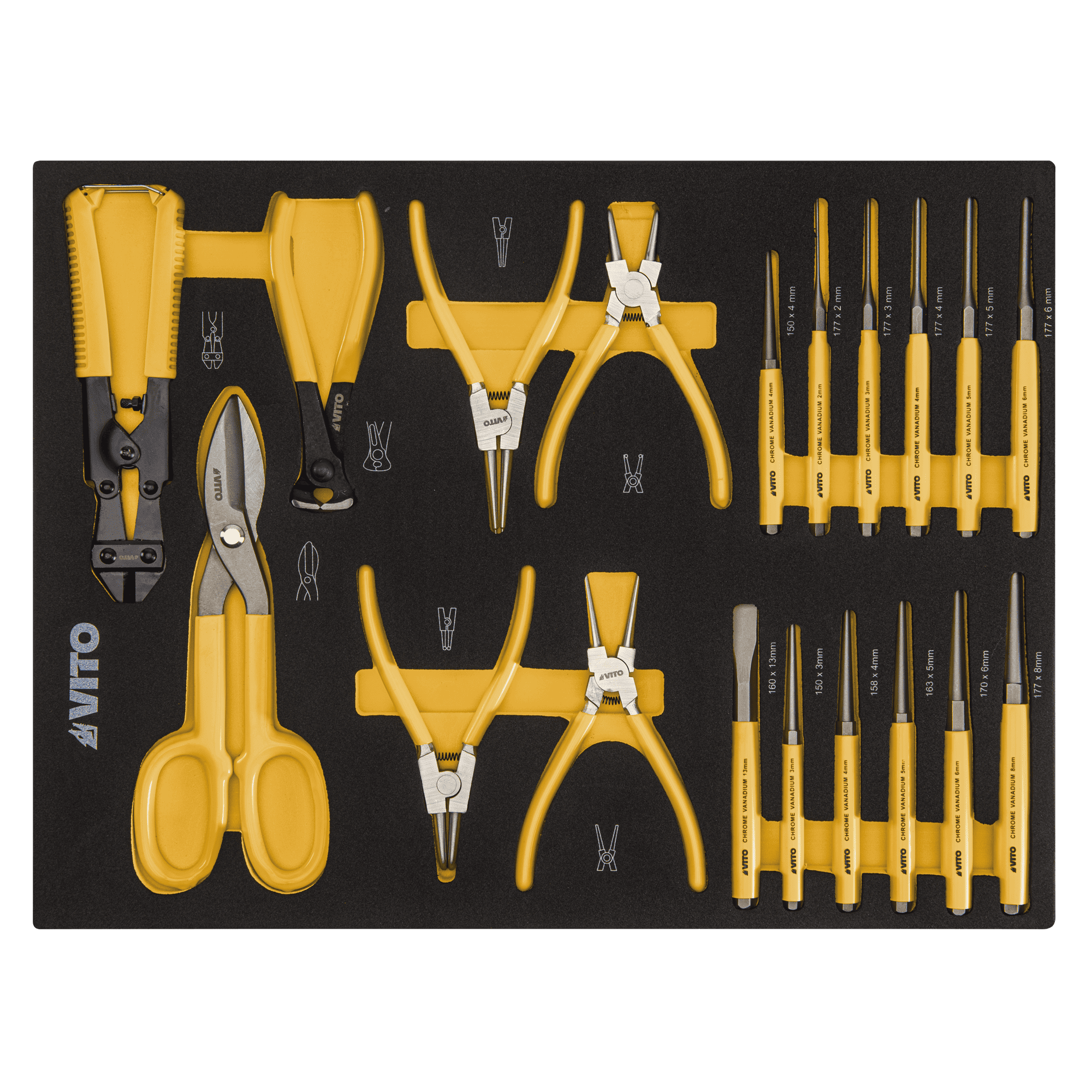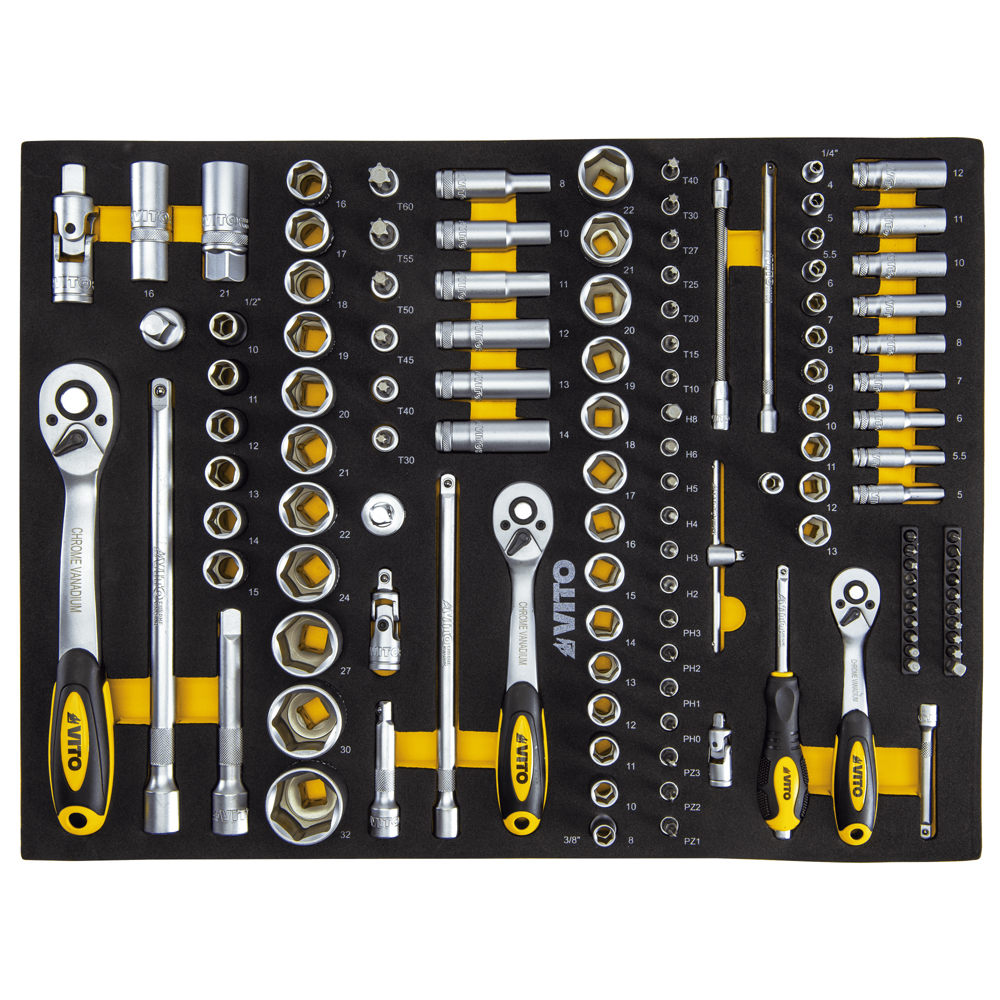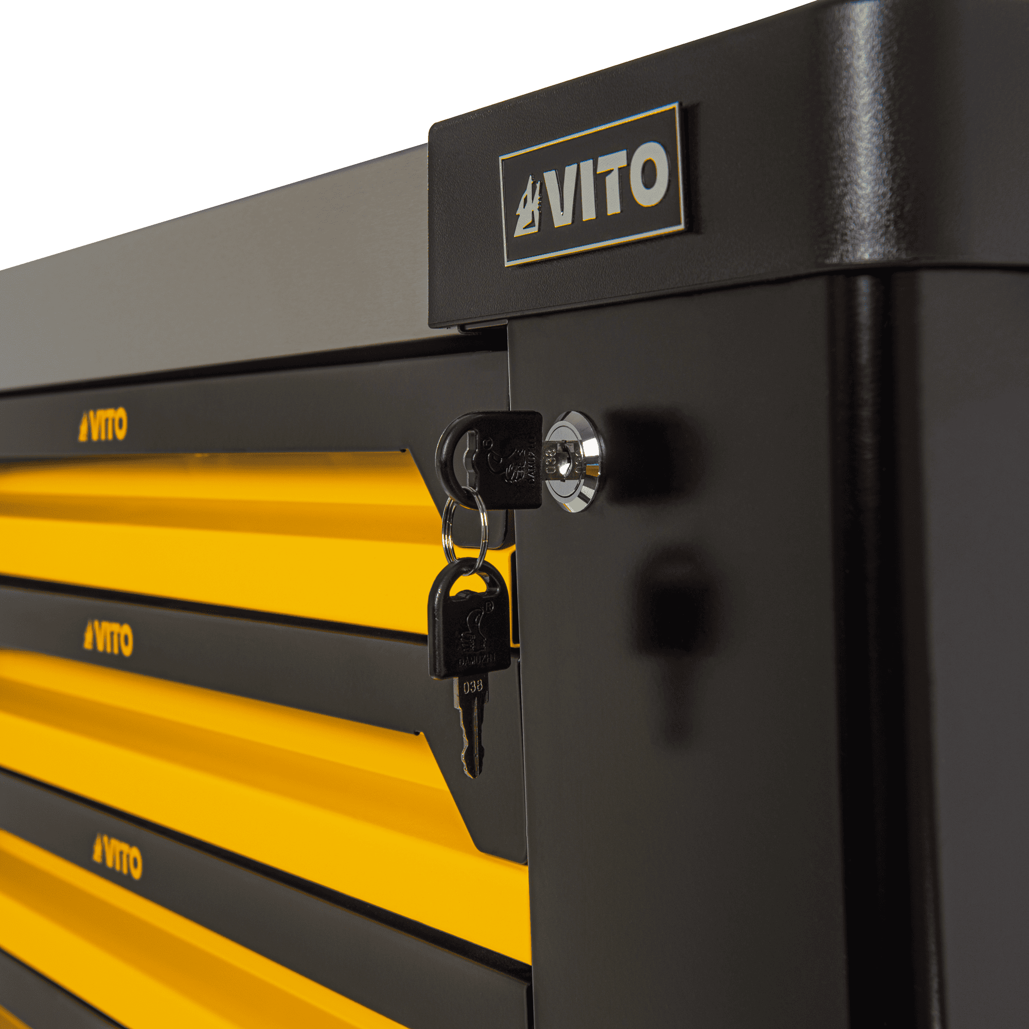 O Trolley da VITO (VITCF7G) vem equipado com um conjunto diversificado de 221 ferramentas de alta qualidade, distribuídas por 5 gavetas, disponibilizando ferramentas necessárias para qualquer projeto. Tem ainda outras 2 gavetas livres e uma porta lateral com fechadura que permite a arrumação de outros objetos ou acessórios. Indispensável para qualquer oficina, garagem ou espaço de trabalho, inclui chaves de fenda, alicates, martelos, chaves de boca e muito mais. O topo deste Trolley, tem uma base resistente em aço inoxidável, permitindo ser utilizado como bancada de trabalho. A superfície das gavetas possui divisórias resistentes a óleos e químicos, permitindo organizar as ferramentas e acessórios de forma segura. Todas as gavetas estão equipadas com guias suaves tendo uma capacidade de carga de 35 kg/45 kg, permitindo o armazenamento de uma variedade de ferramentas sem comprometer a funcionalidade do Trolley. Para garantir a segurança da arrumação e ferramentas, este modelo está equipado com fechadura das gavetas e fechadura da porta lateral com duas chaves cada.