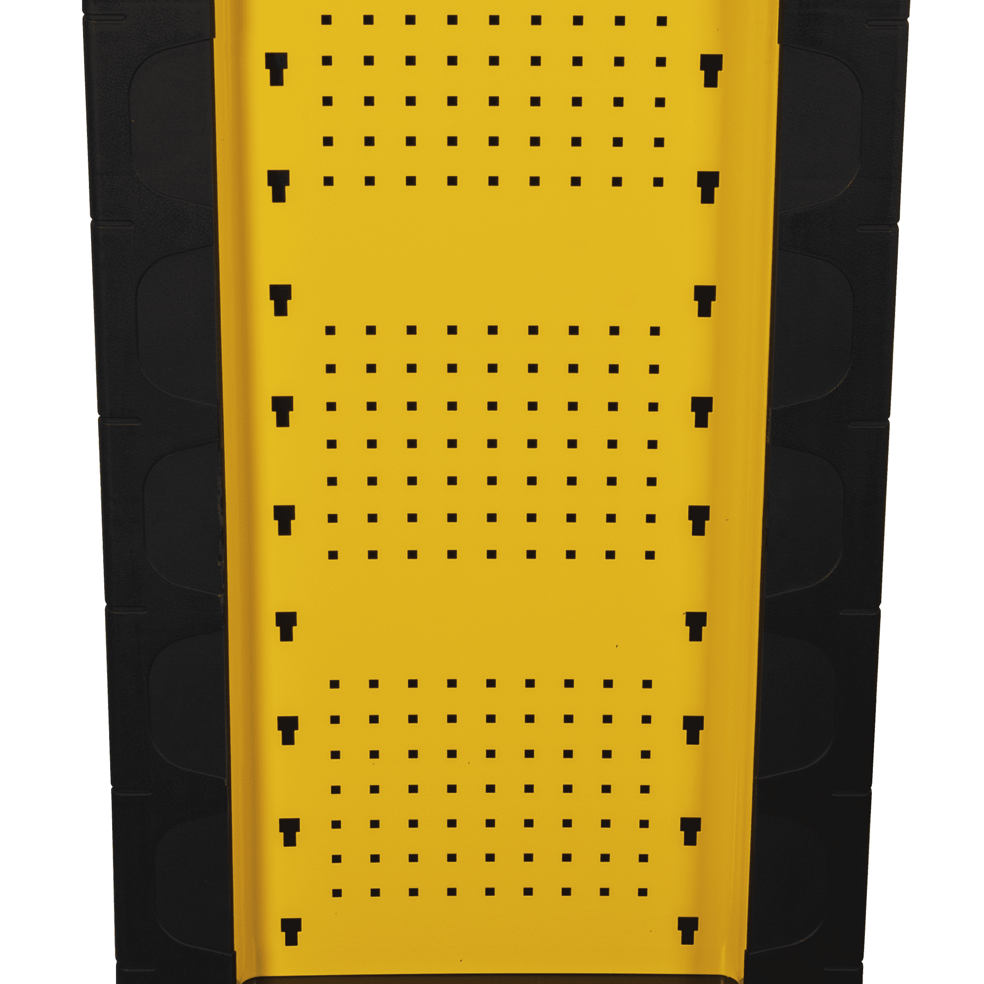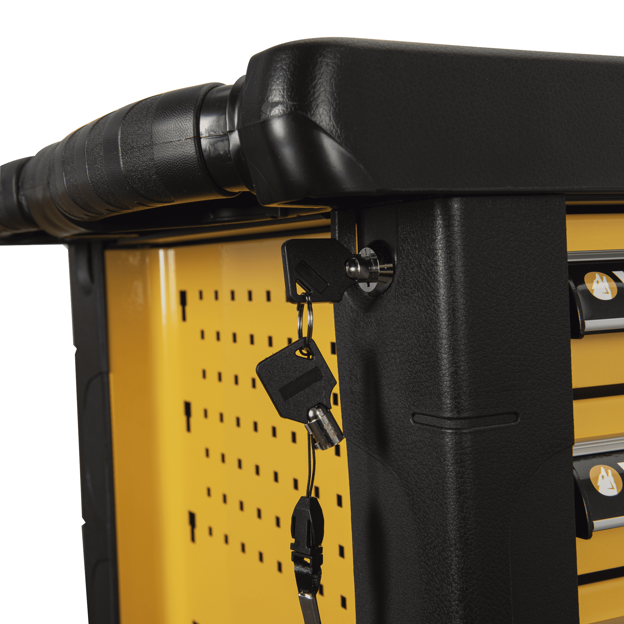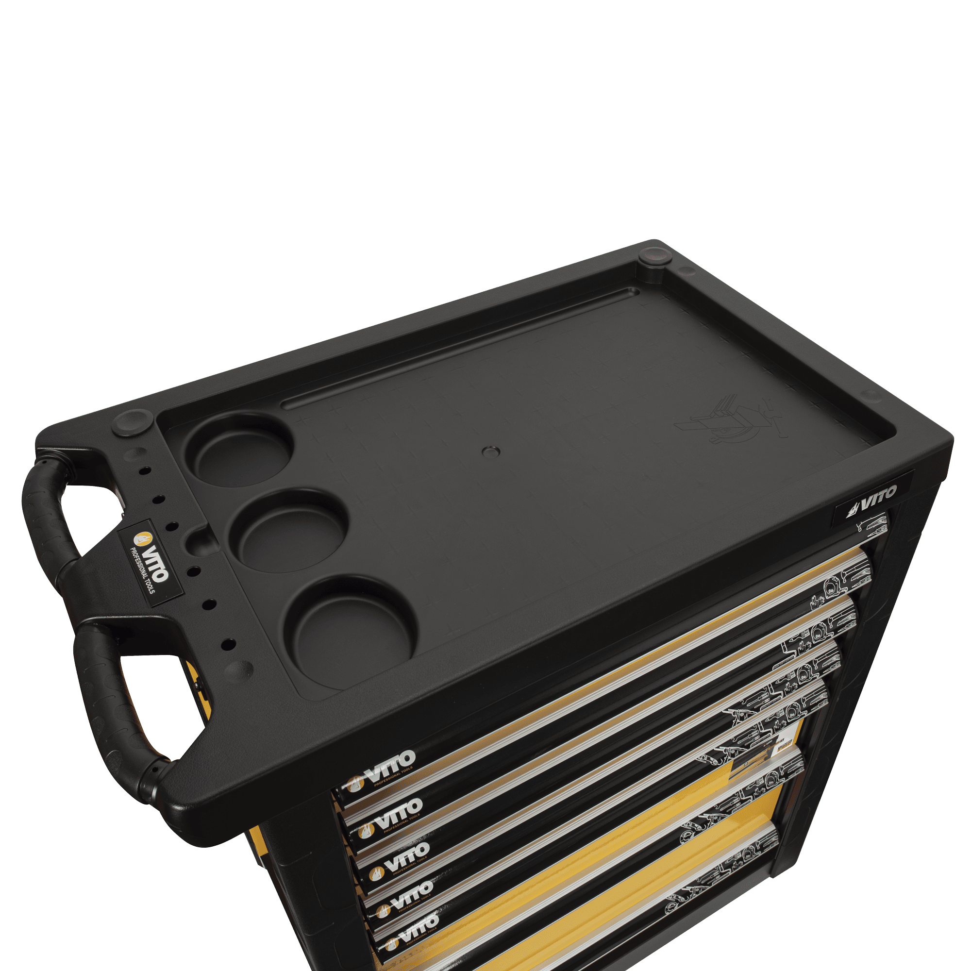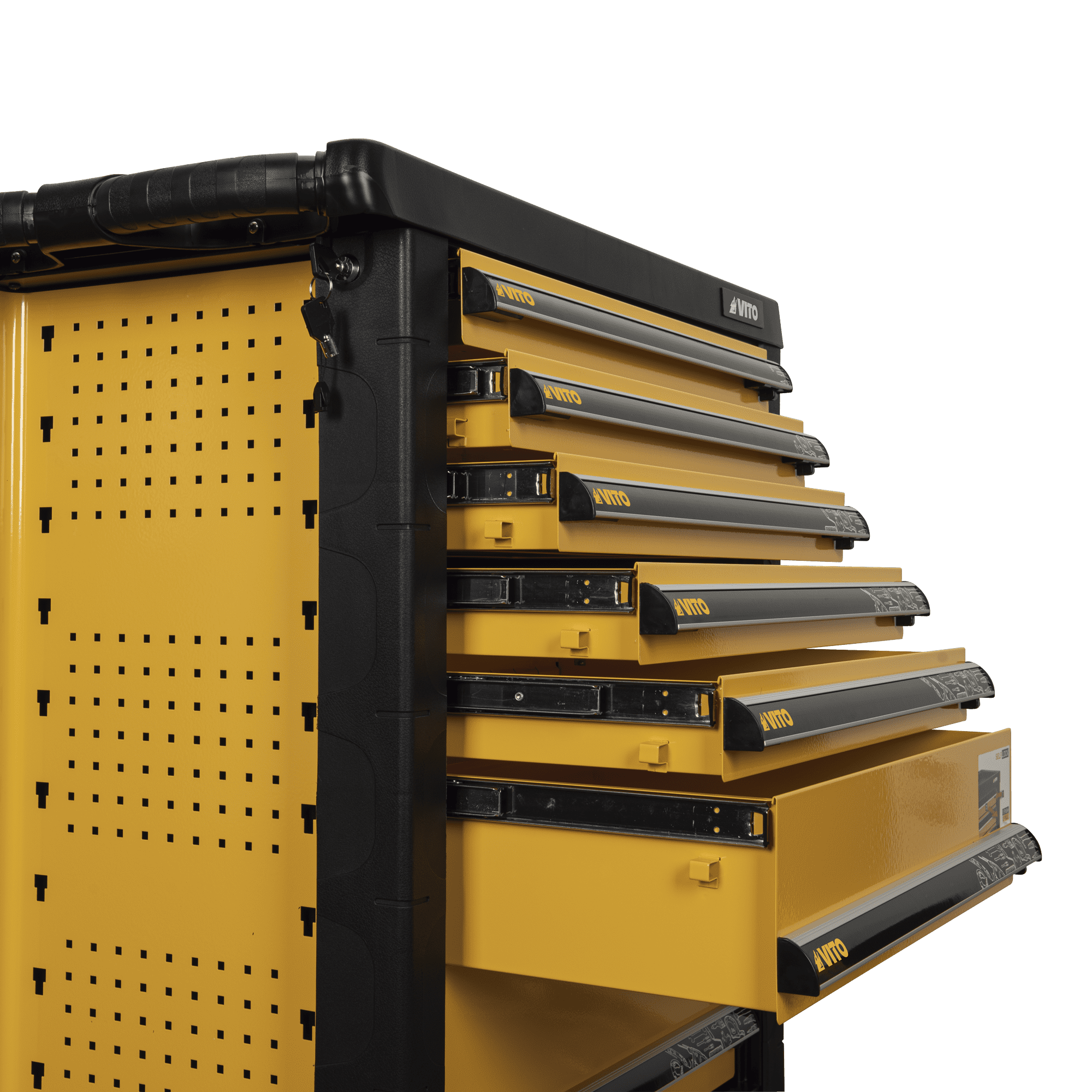 Carro para Ferramentas com 7 Gavetas, equipado com estrutura reforçada com parede dupla, tem um bloqueio individual de gavetas, com rodas em borracha com um tamanho de 125 mm de diâmetro, possui 2 rodas traseiras giratórias, uma com travão, carro equipado com 5 gavetas de 65 mm com um peso máximo de 25kg, 1 gaveta com 135 mm e um peso máximo de 35kg, tem ainda 1 gaveta com 205 mm e um peso máximo de 35kg, possui um fecho centralizado por fechadura com chave, local para aplicação do torno na superfície de trabalho, com laterais perfuradas para armazenamento adicional e gavetas deslizantes com rolamento de esferas.