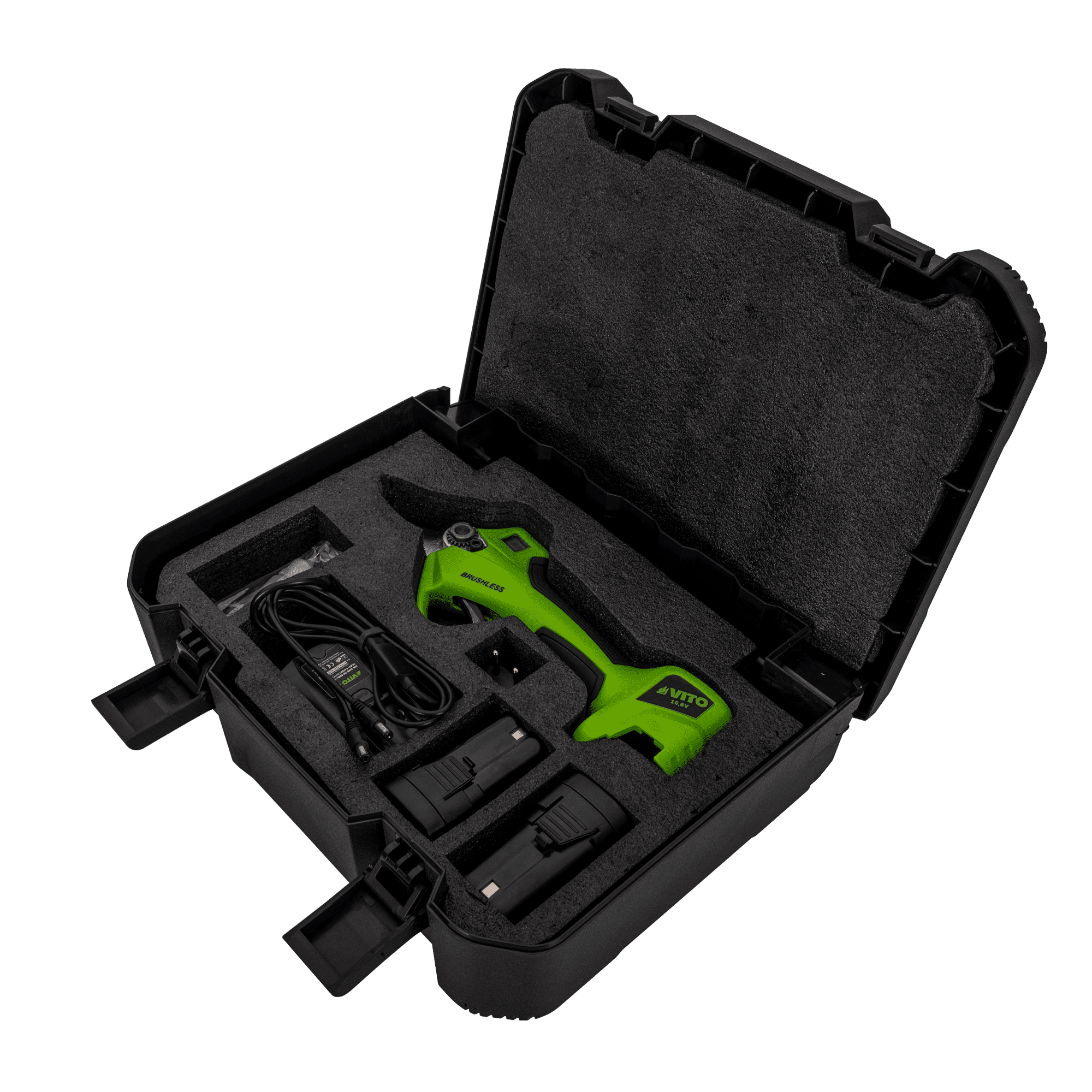 Tesoura de poda a bateria, perfeita para pomares e jardins. Equipada com lâminas de excelente qualidade para cortes precisos até 32mm. Leve, confortável e prática, reduzindo fadiga e tensão nas mãos e braços. Motor "Brushless" proporciona durabilidade. Sistema de corte progressivo aumenta liberdade de movimentos. Inclui sistema de segurança que bloqueia corte em contato com a pele. Display mostra cortes, carga da bateria e erros em formato alfanumérico. Punho ergonómico com aplicações de borracha. Acompanha carregador dual para 2 baterias.
