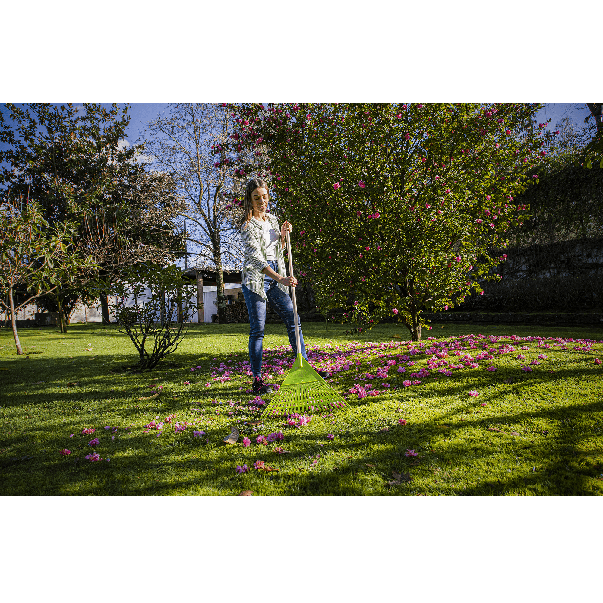 VASSOURA DE RELVA PLÁSTICA COM CABO DE MADEIRA
