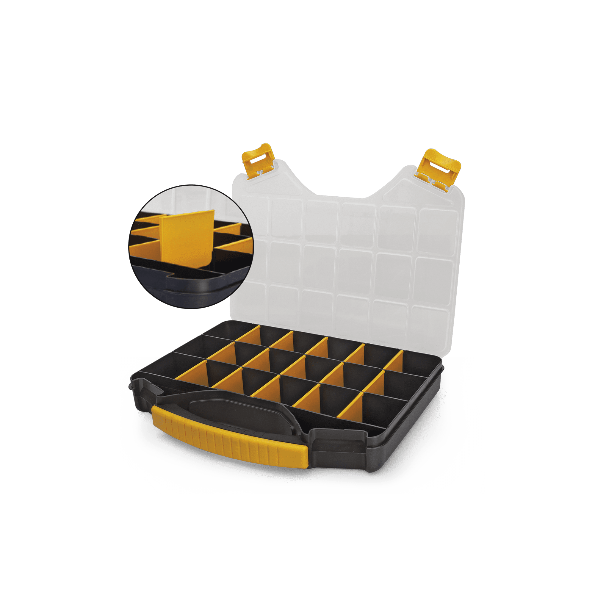 Caixa de Arrumação Multiusos com estrutura resistente em polipropileno, equipada com compartimentos ajustáveis e uma pega de transporte, contém ainda 18 compartimentos para uma arrumação prática e eficaz.