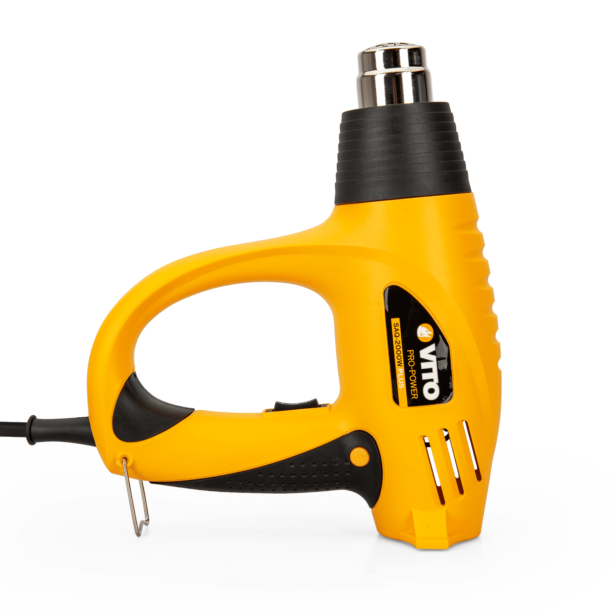 Soprador de Ar Quente, com uma potência nominal de 2000W com 2 velocidades, com um caudal de ar na 1ª velocidade de 300L/min e uma temperatura de 450ºC, na 2ª velocidade tem um caudal de ar de 500L/min e uma temperatura de 600ºC, para realizar todas as suas tarefas, com qualidade e de modo profissional.