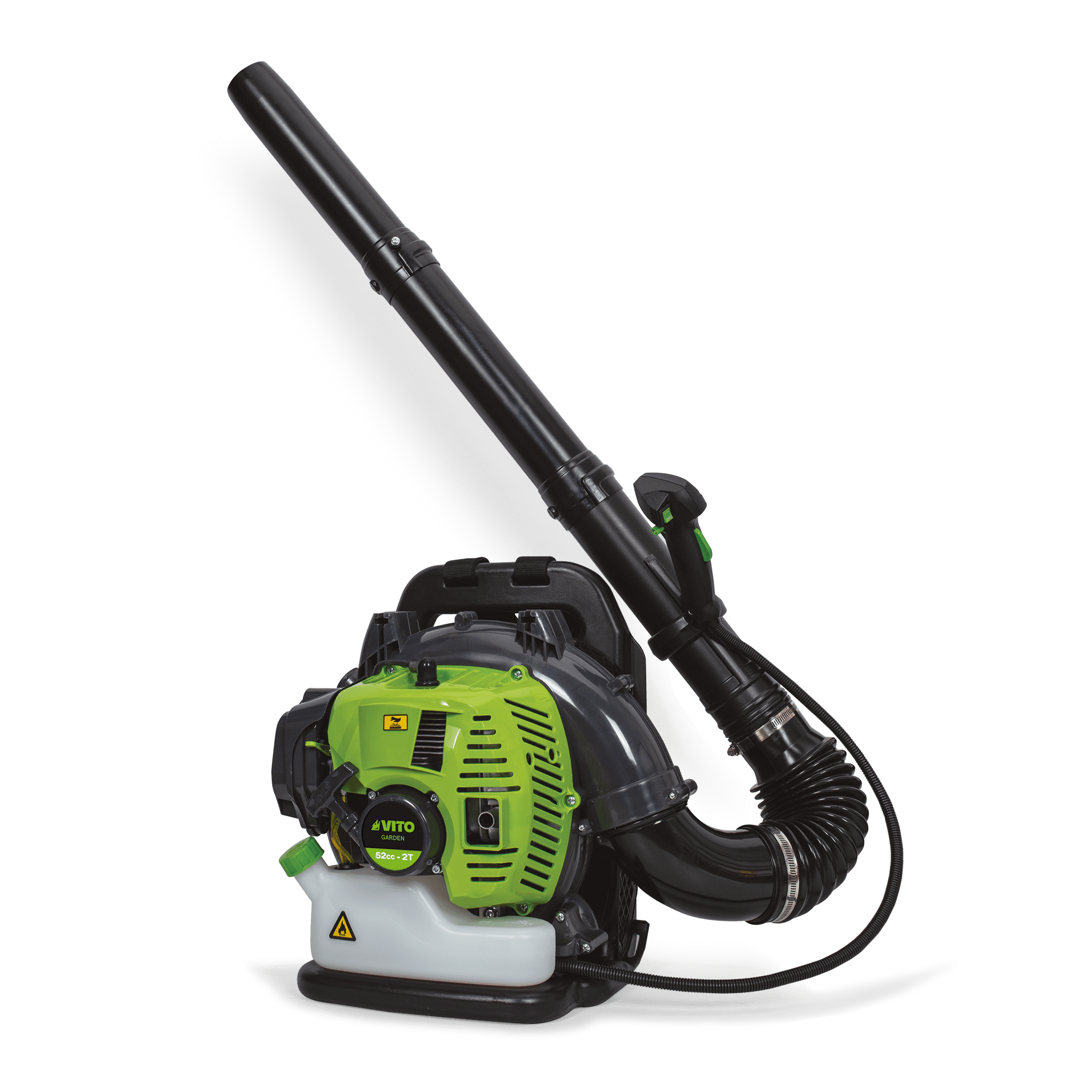 Soprador Mochila com uma potência de 2cv e 52cc, com um motor 2 tempos, tem uma velocidade de 6500rpm, com uma capacidade do depósito de combustível de 1,5L para mistura de combustível, tem uma velocidade de ar de 90m/s e um fluxo de ar 0,25m3/min.